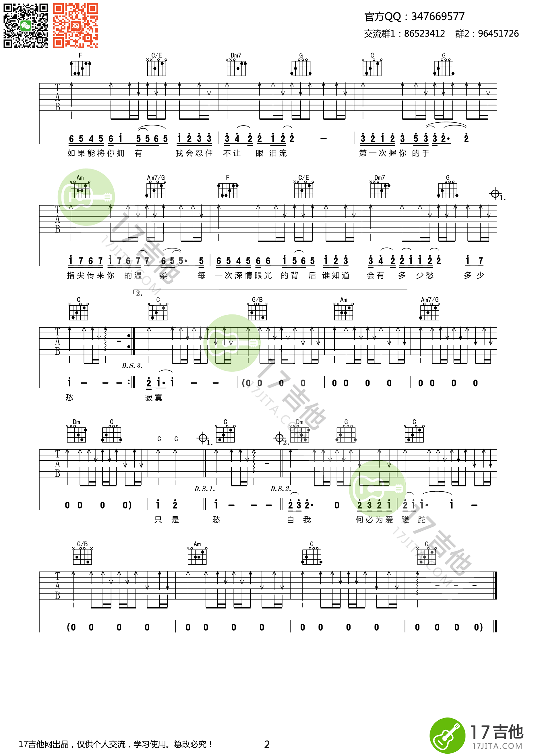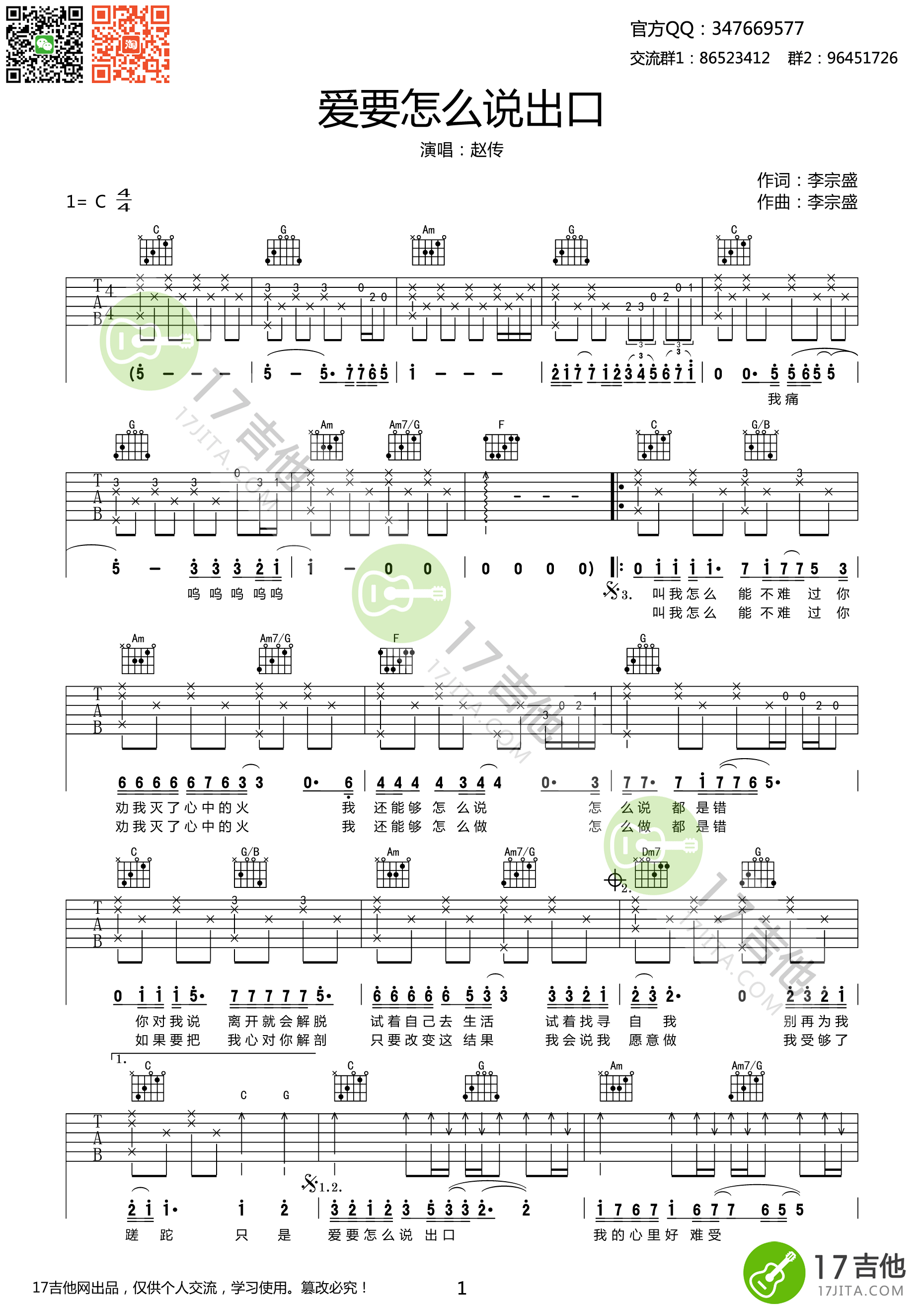曲谱介绍: 17吉他梦想的声音第10期《爱要怎么说出口》吉他弹唱谱,采用C调指法编配,共有2张高清图谱,免翻页排版设计。