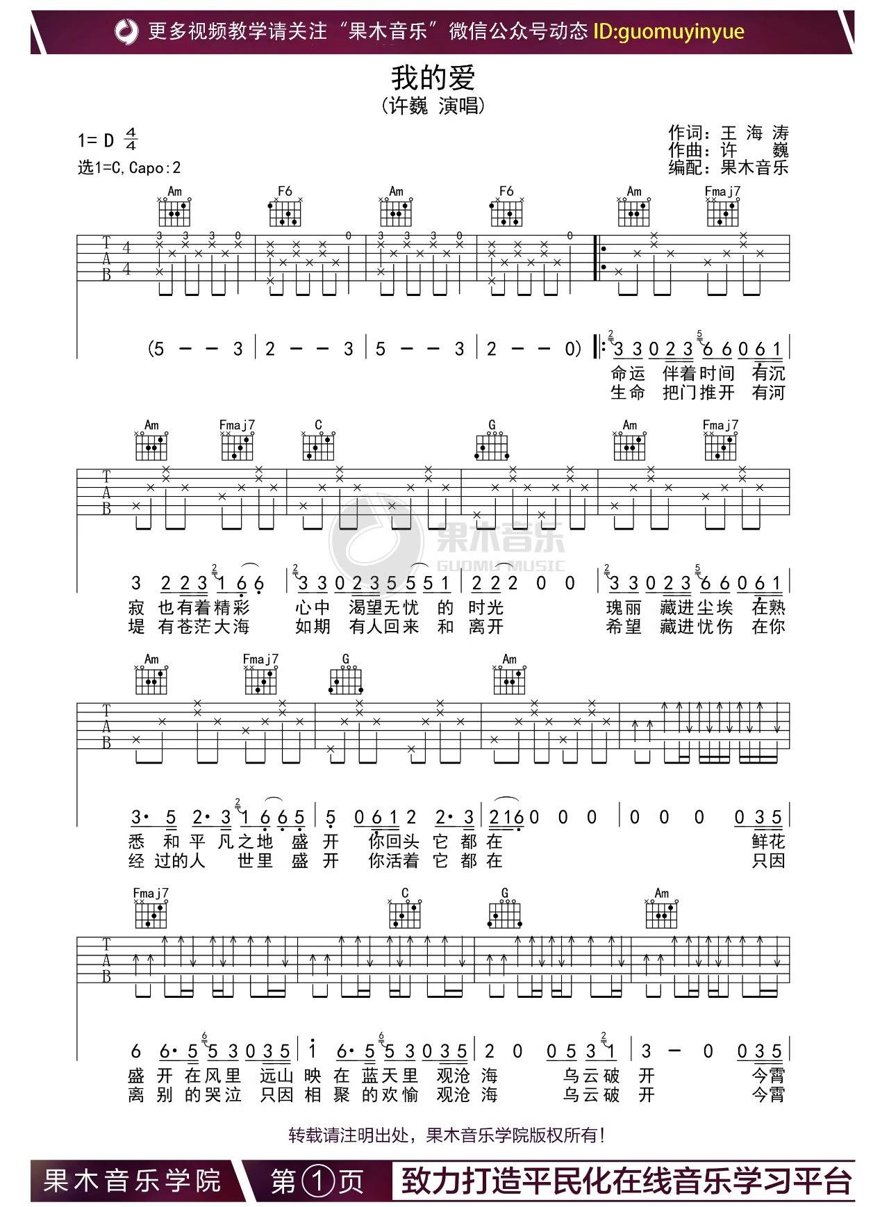 曲谱介绍: 许巍《我的爱》吉他弹唱谱,采用C调指法编配,果木音乐编配出品,共有2张高清图谱,免翻页排版设计。