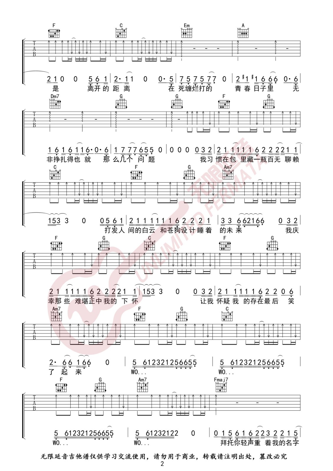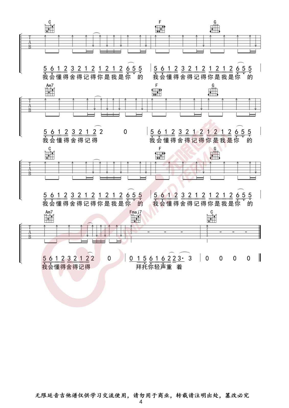 曲谱介绍: 焦迈奇《我的名字》吉他弹唱谱,采用C调指法编配,共有4张高清图谱。