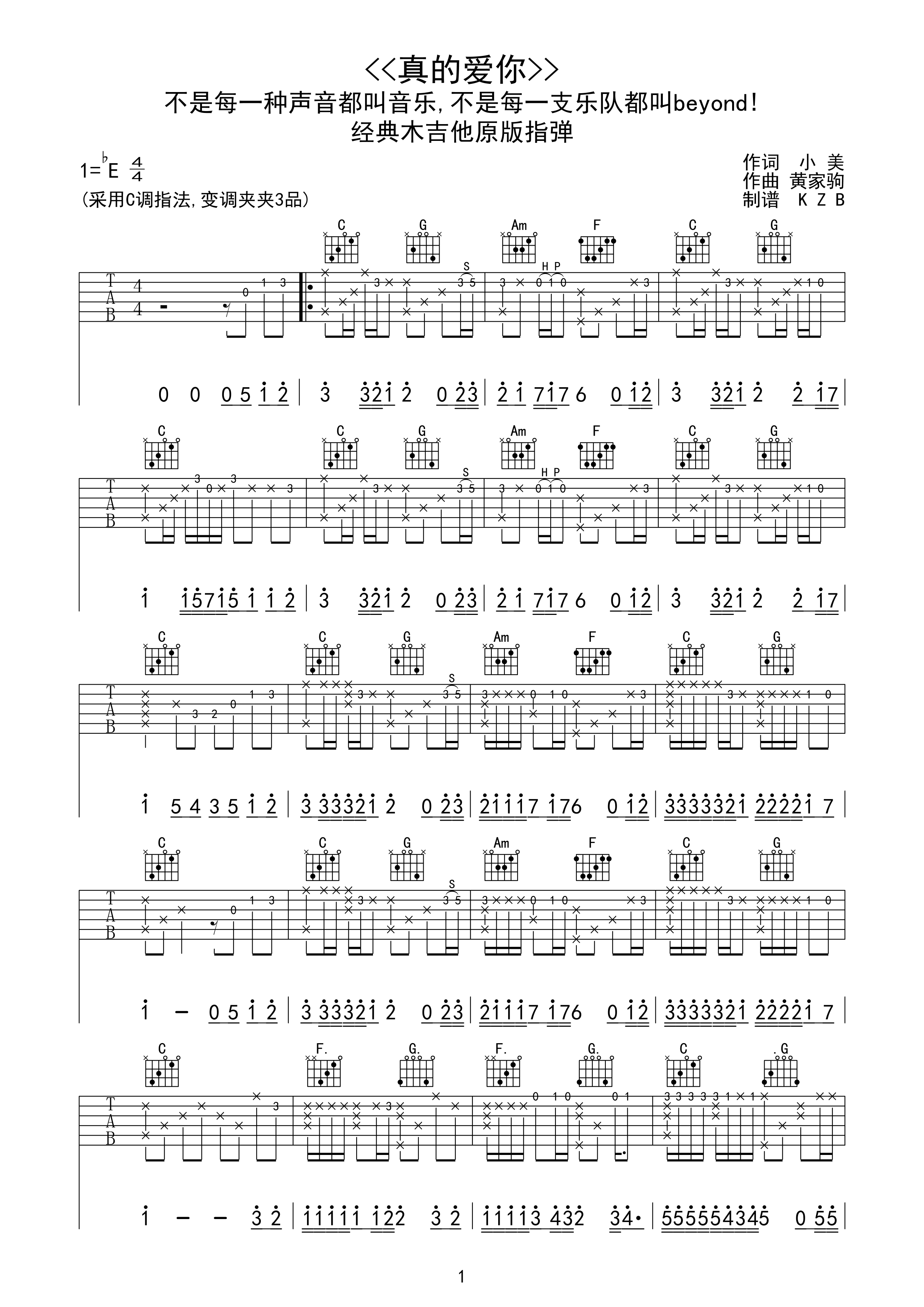 曲谱介绍: beyond《真的爱你》吉他独奏谱,采用E调指法编配原版,共有2张高清图谱,免翻页排版设计。