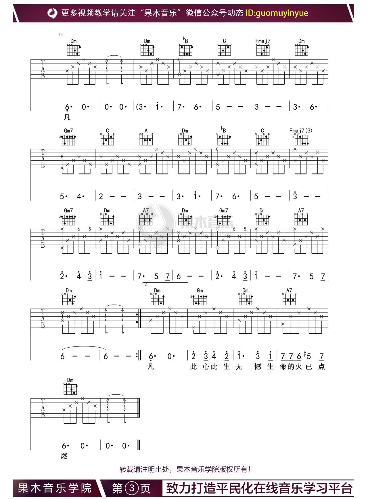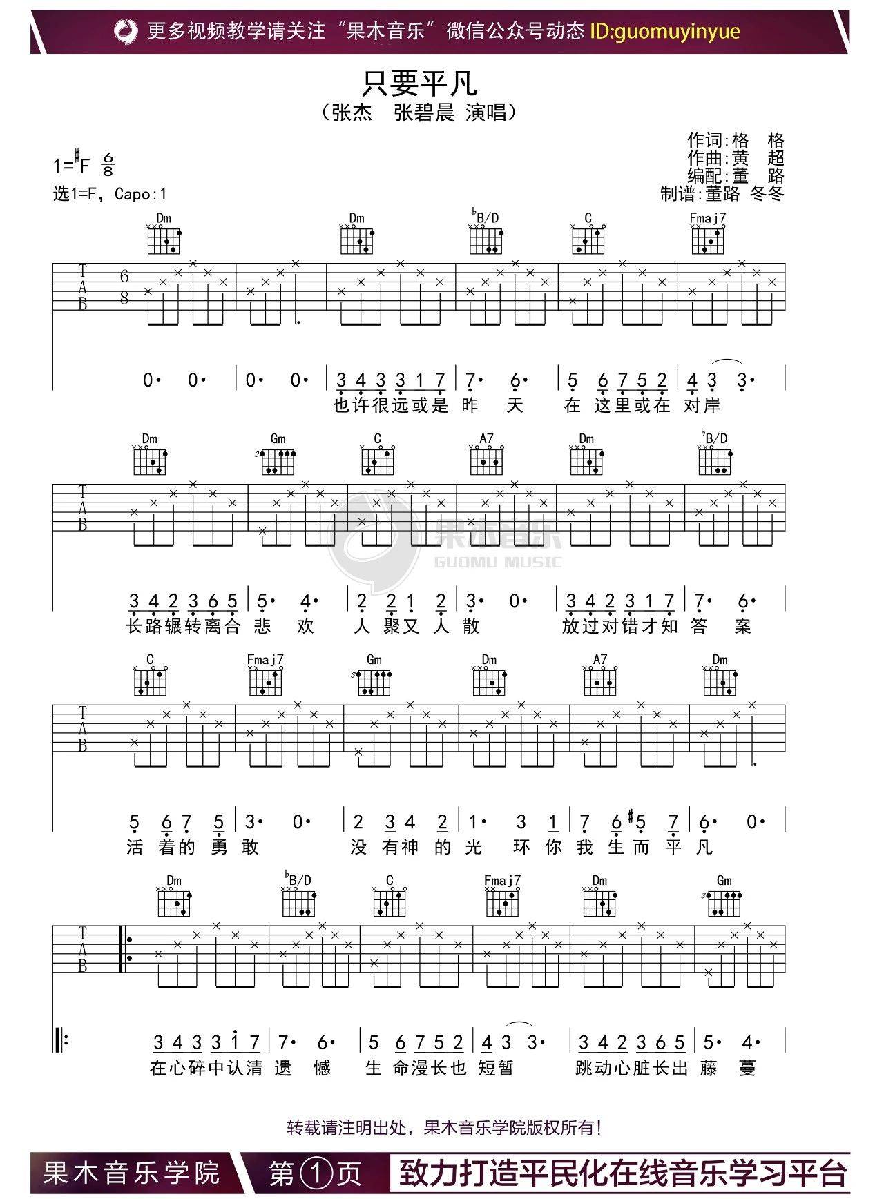 曲谱介绍: 张杰《只要平凡》吉他弹唱谱,采用F调指法编配,果木浪子编配出品,共有3张高清图谱。