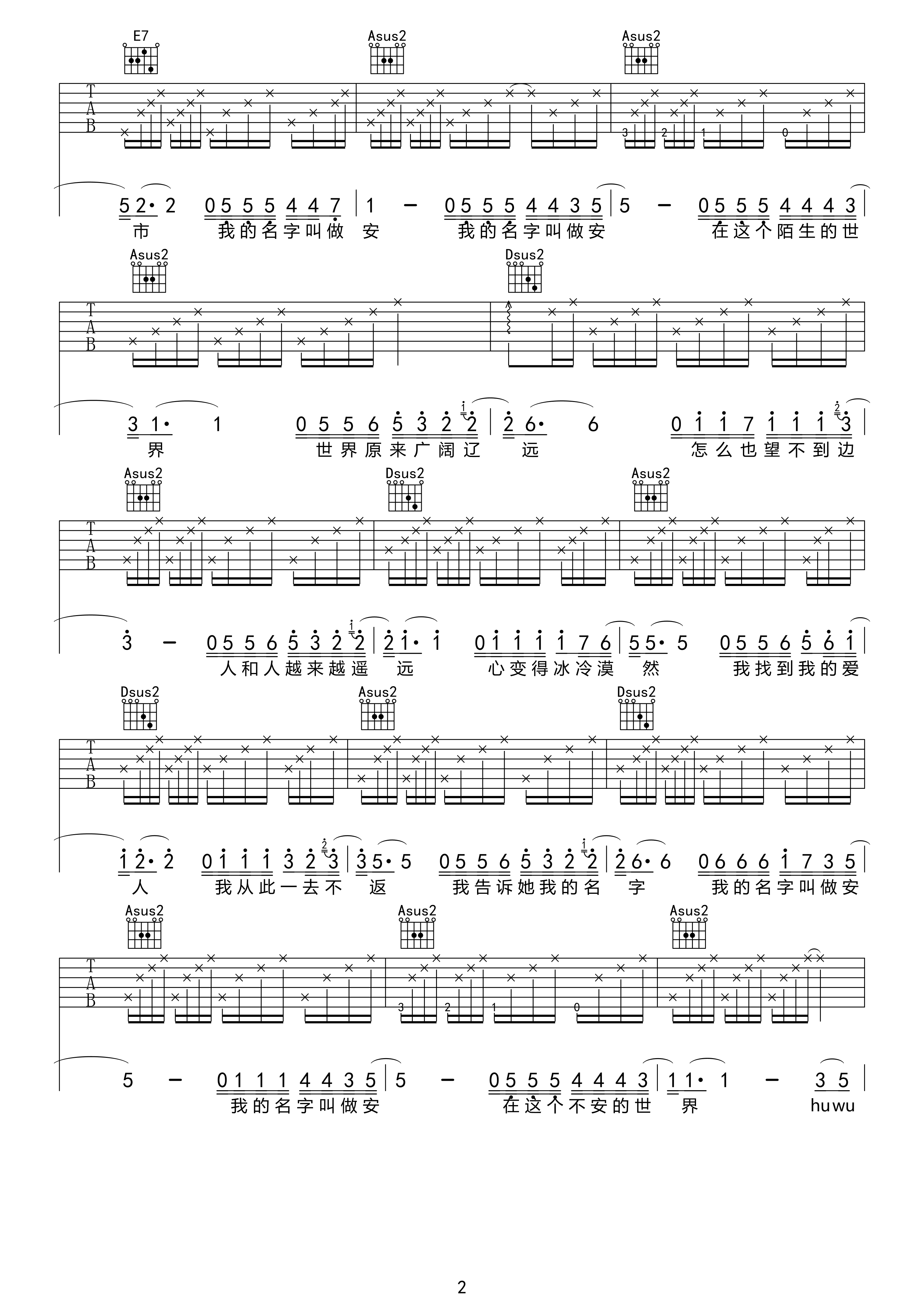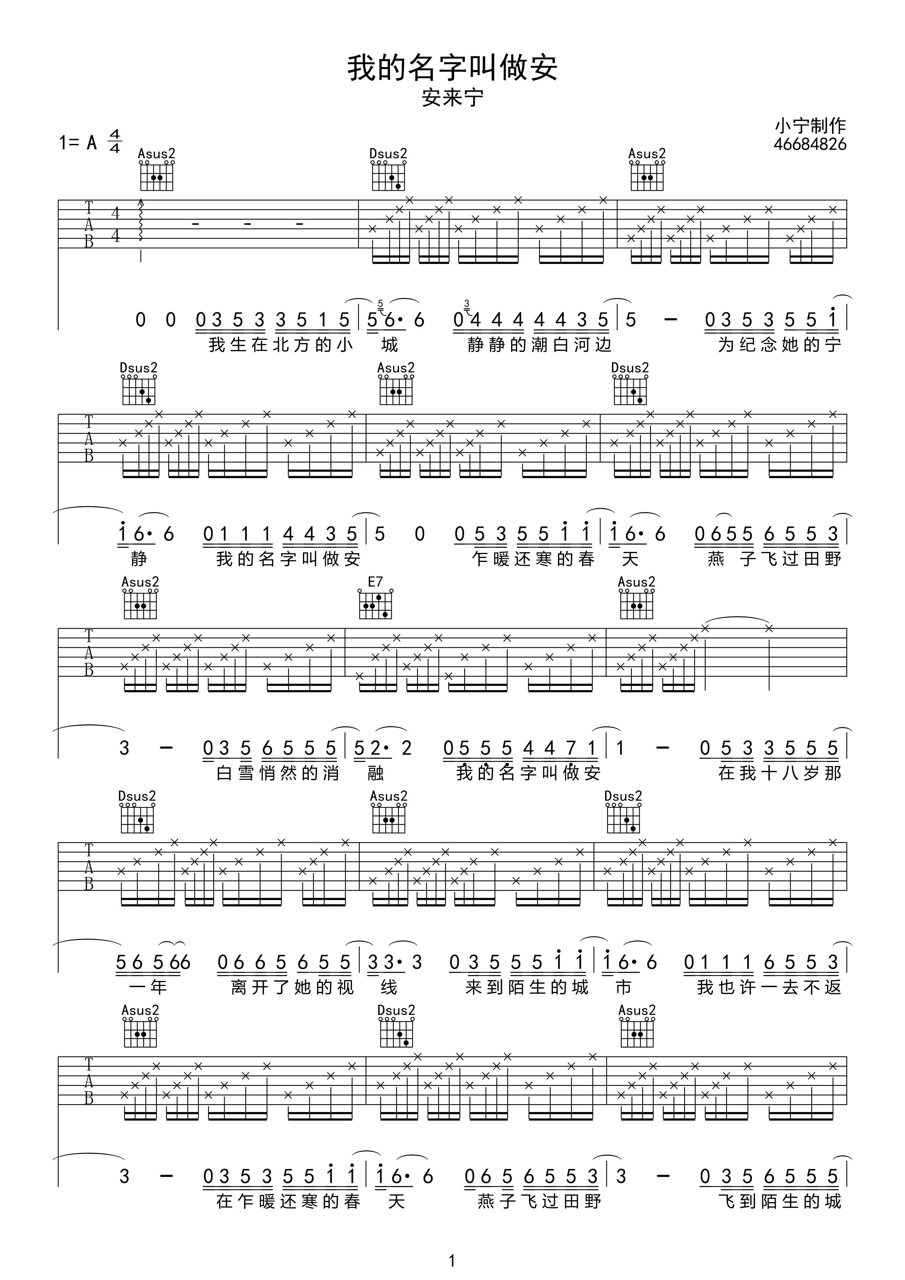 曲谱介绍: 安来宁《我的名字叫做安》吉他弹唱谱,采用A调指法编配原版,共有5张高清图谱。