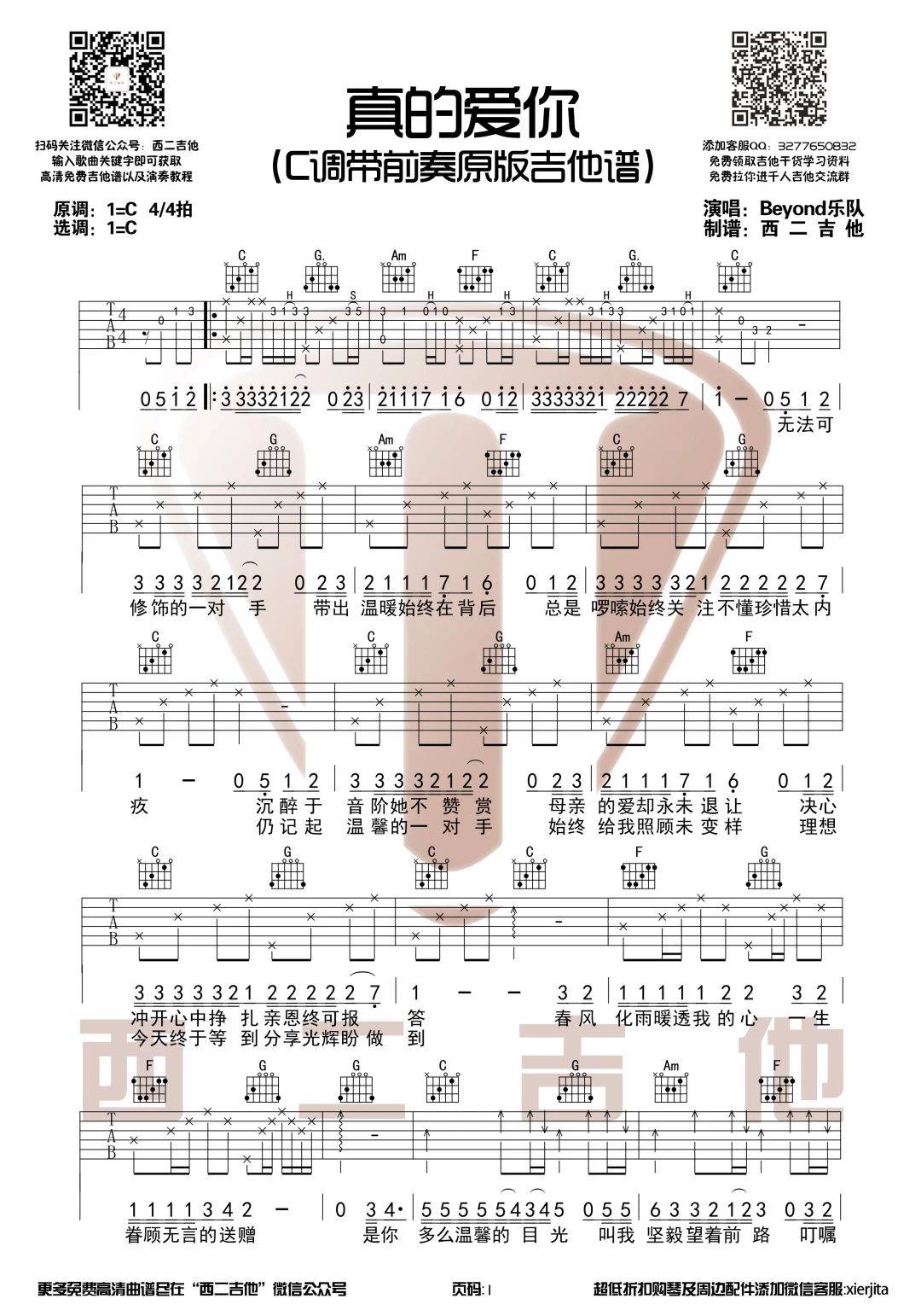 曲谱介绍: Beyond《真的爱你》吉他弹唱谱,采用C调指法编配原版,西二吉他编配出品,共有2张高清图谱,免翻页排版设计。