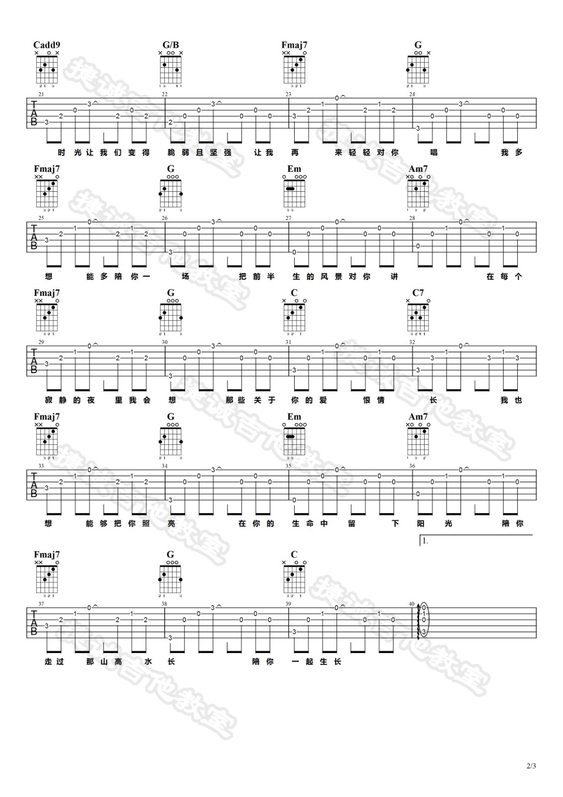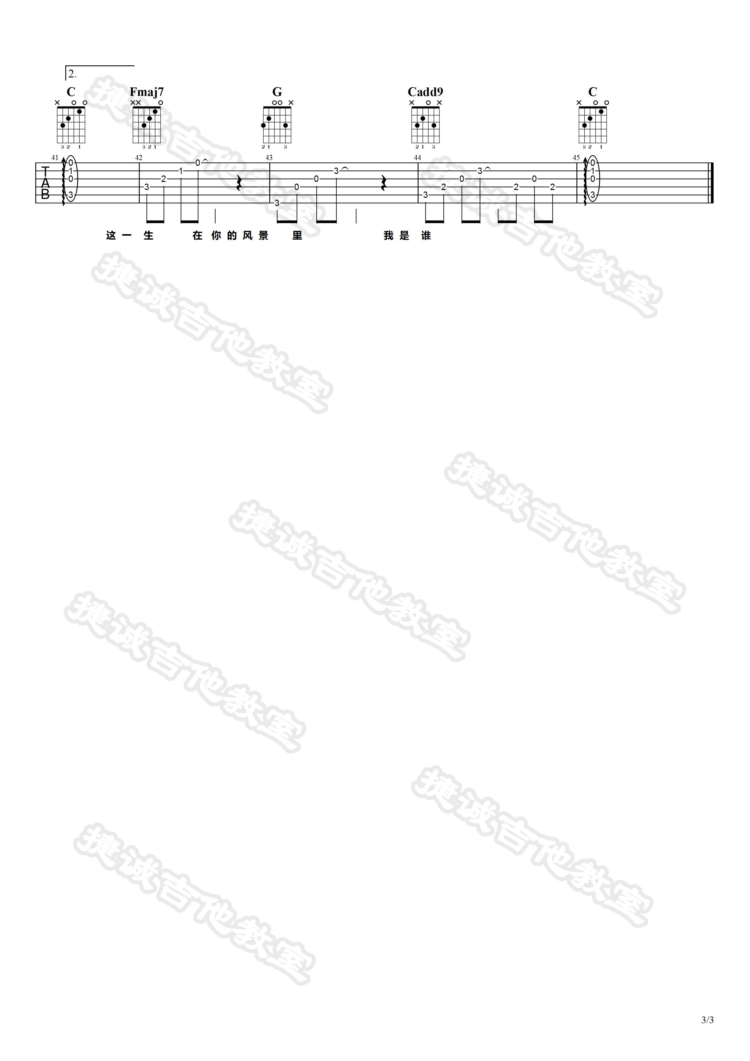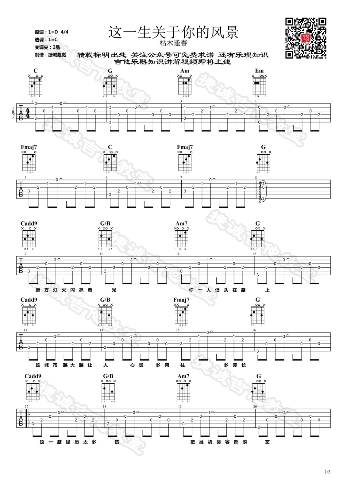 曲谱介绍: 枯木逢春《这一生关于你的风景》吉他弹唱谱,采用C调指法编配,捷诚吉他教室编配出品,共有3张高清图谱。