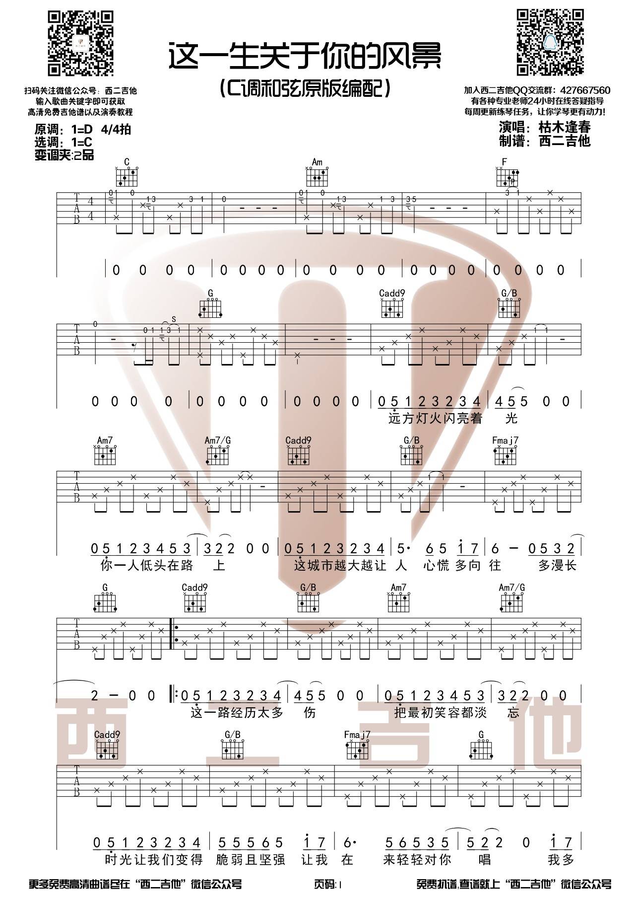 曲谱介绍: 枯木逢春《这一生关于你的风景》吉他弹唱谱,采用C调指法编配原版,西二吉他编配出品,共有3张高清图谱。