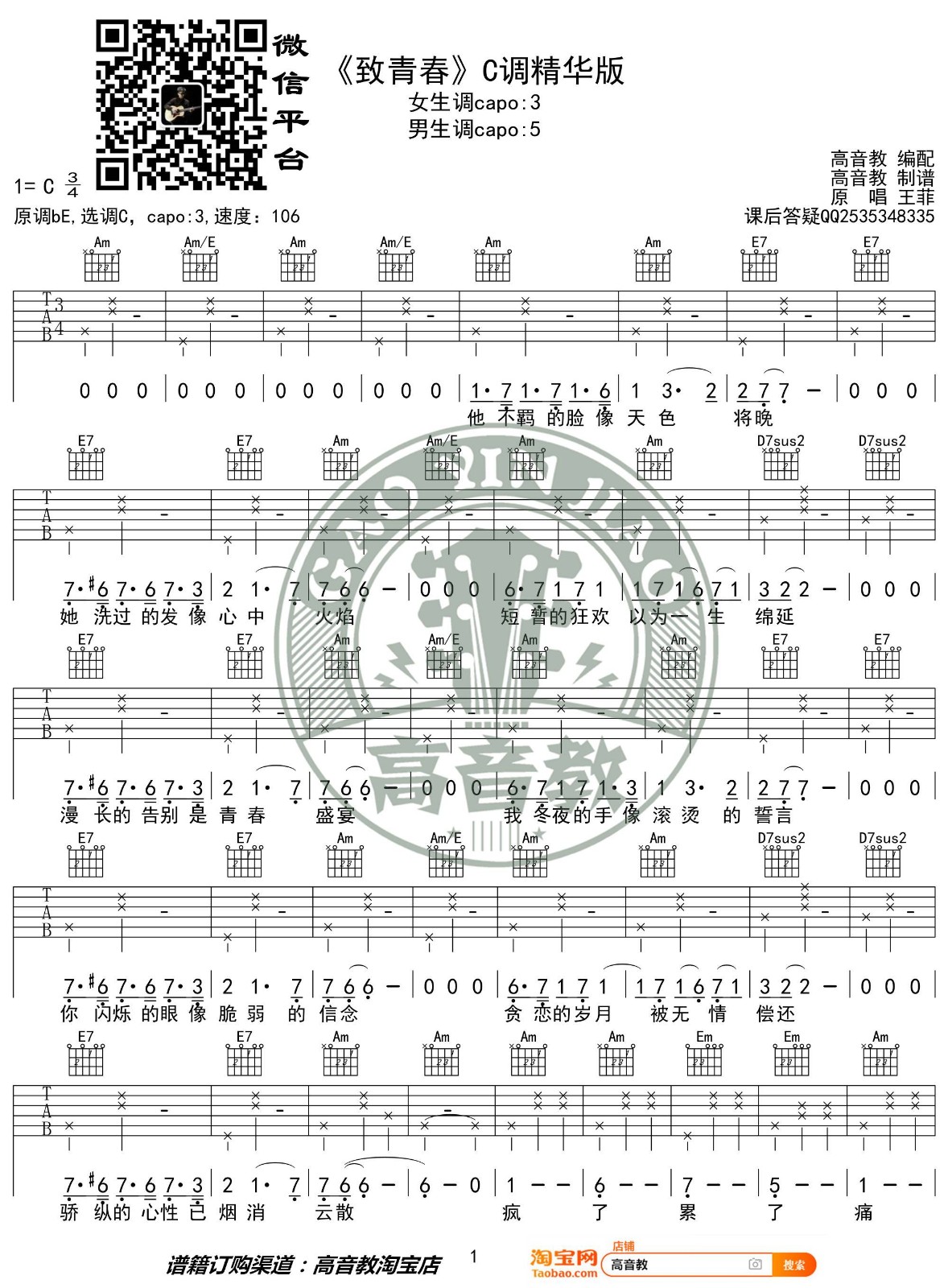 曲谱介绍: 王菲《致青春》吉他弹唱谱,采用C调指法编配,高音教编配出品,共有2张高清图谱,免翻页排版设计。