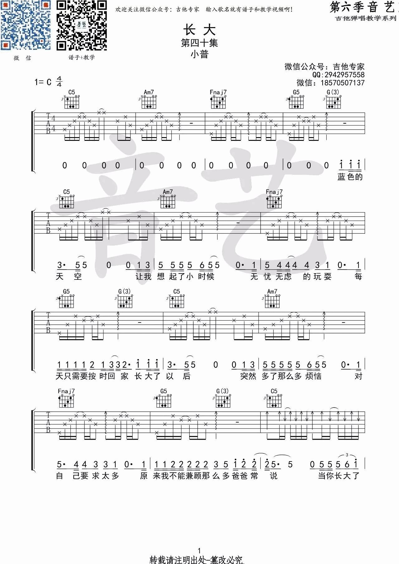 曲谱介绍: 小普《长大》吉他弹唱谱,采用C调指法编配,音艺吉他编配出品,共有4张高清图谱。