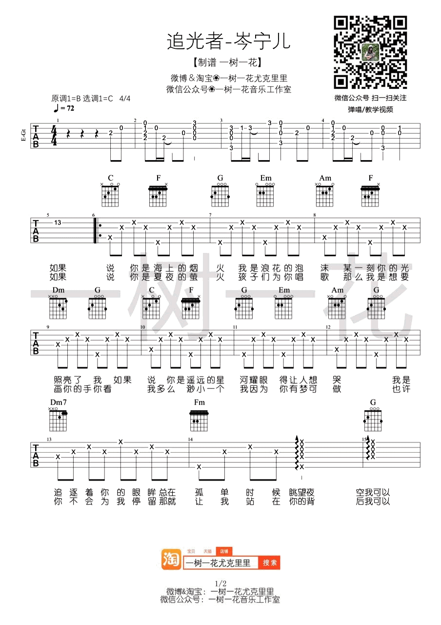 曲谱介绍: 岑宁儿《追光者》吉他弹唱谱,采用C调指法编配,一树一花编配出品,共有2张高清图谱,免翻页排版设计。