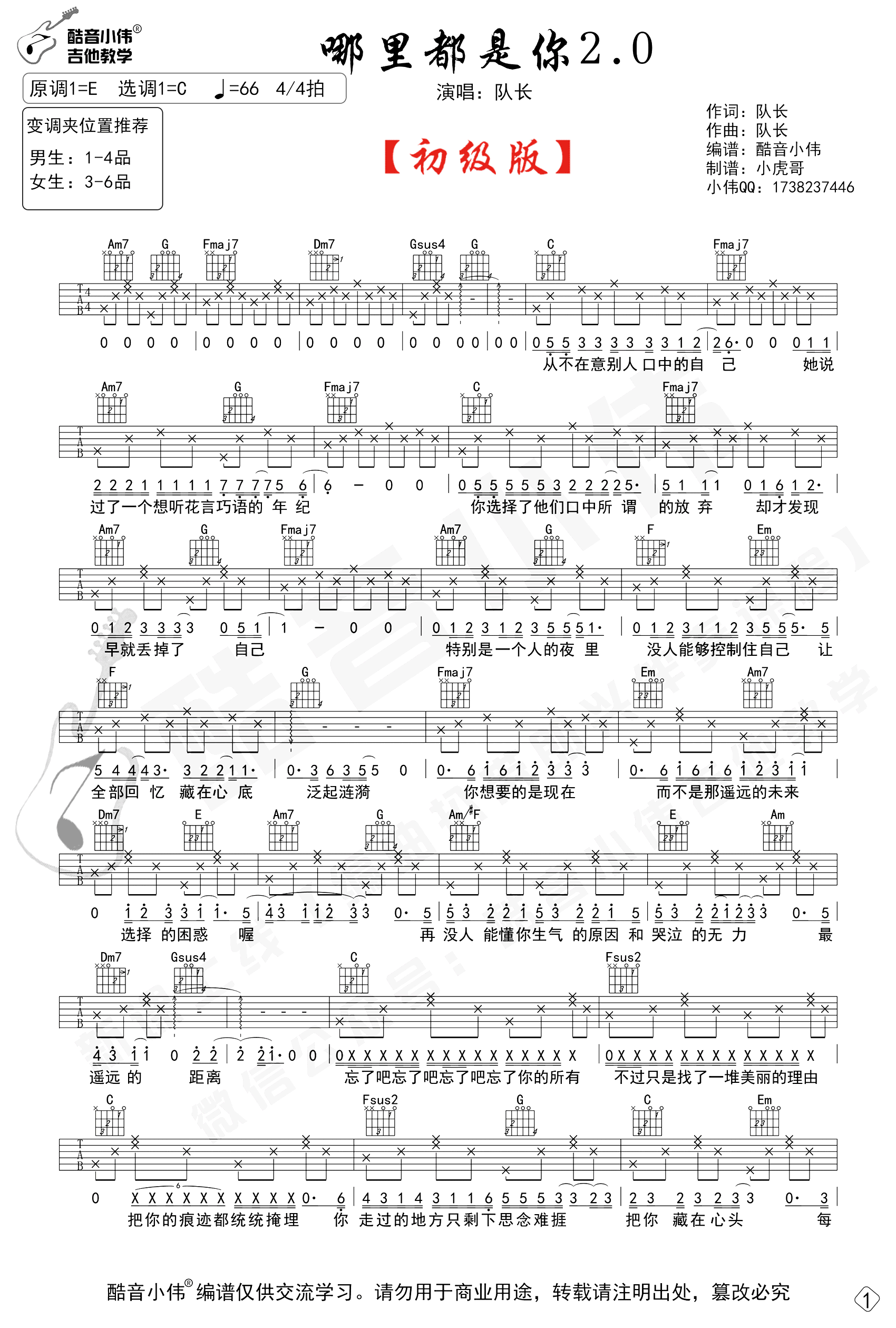 曲谱介绍: 《哪里都是你2.0》吉他弹唱谱,原调E选调C,初级版编配,变调夹推荐位置,男生1-4品女生3-6品,两张图片六线谱。