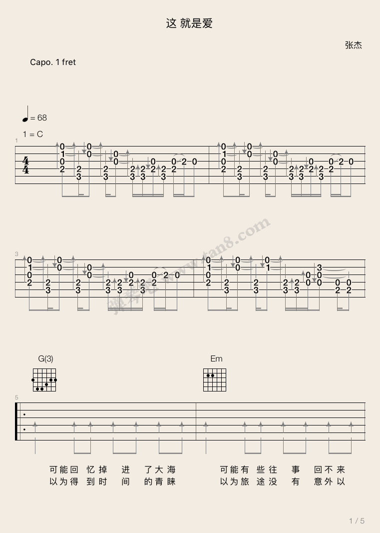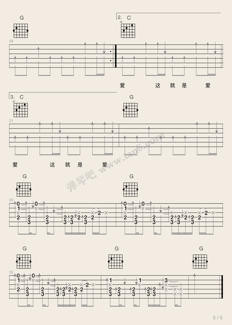 曲谱介绍: 张杰《这就是爱》吉他弹唱谱,采用C调指法编配,弹琴吧编配出品,共有5张高清图谱。