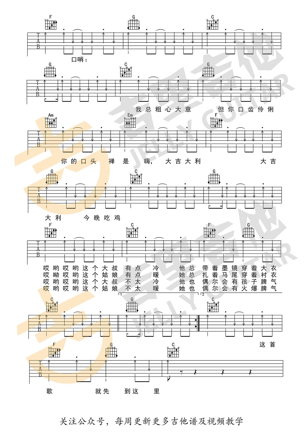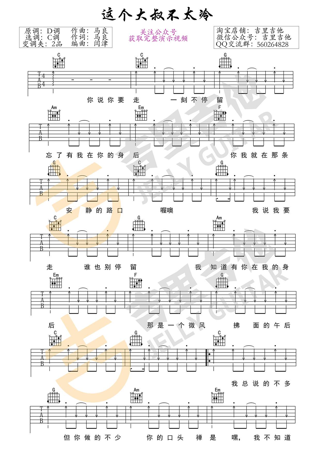 曲谱介绍: 花粥《这个大叔不太冷》吉他弹唱谱,采用C调指法编配,吉里吉他编配出品,共有2张高清图谱,免翻页排版设计。