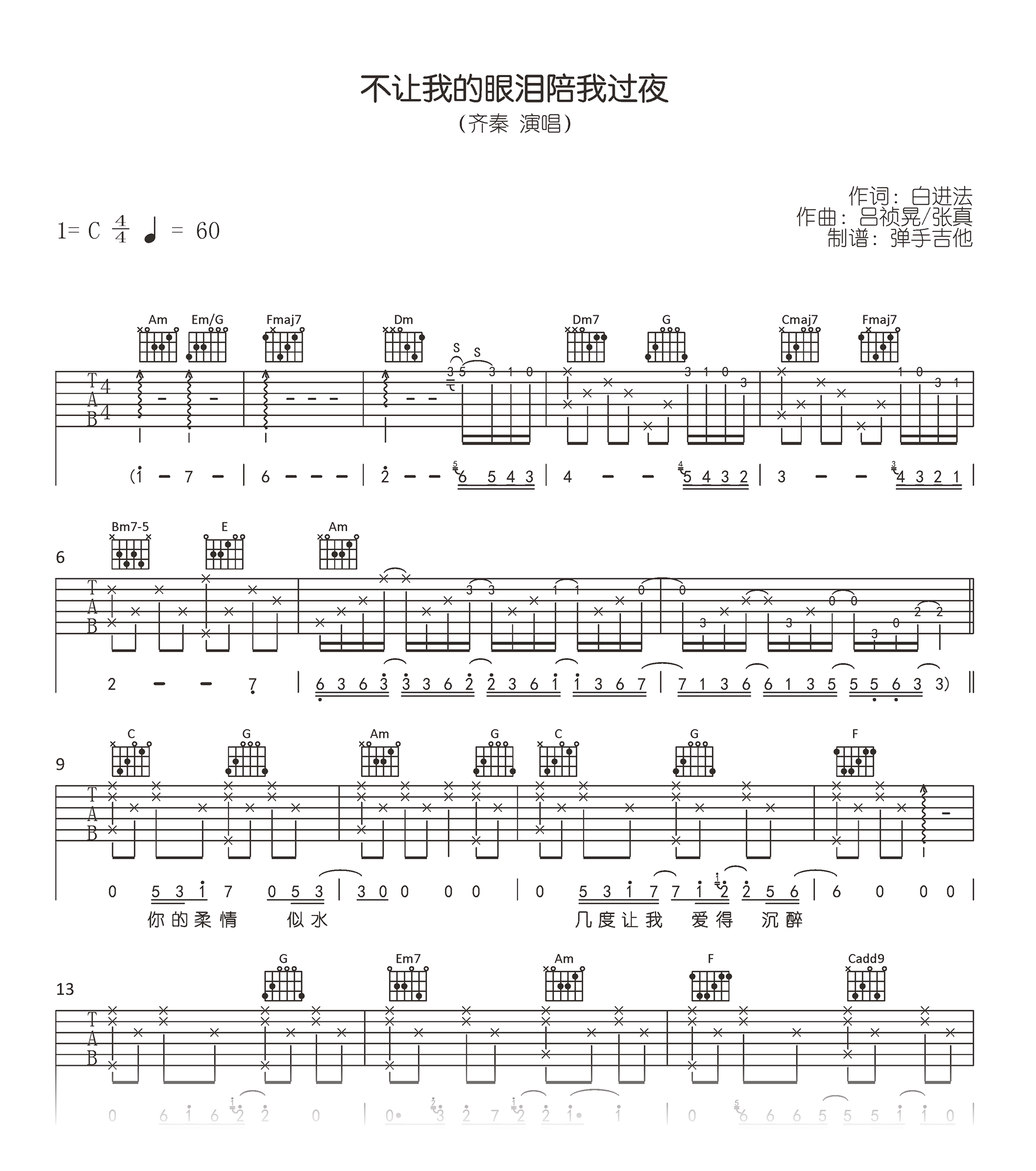曲谱介绍: 《不让我的眼泪陪我过夜》吉他弹唱谱,C调和弦指法编配,完整版共三张高清图片六线谱。