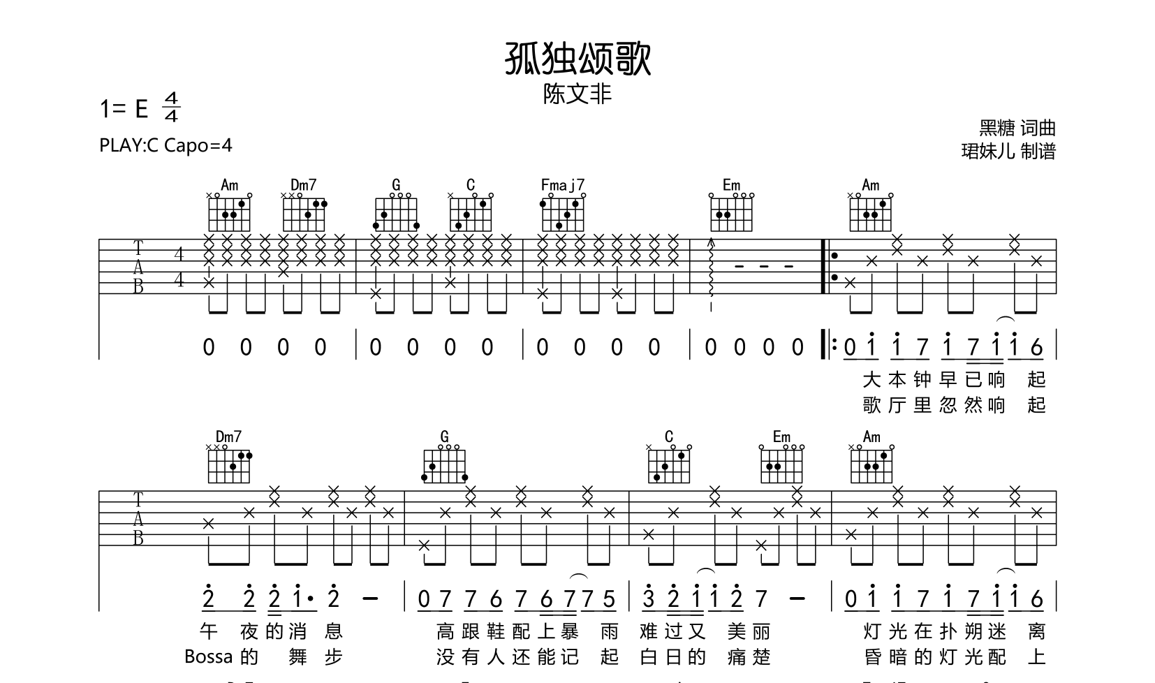 曲谱介绍: 陈文非《孤独颂歌》吉他谱,由@珺妹儿制谱,《孤独颂歌》吉他弹唱谱,共两张图片谱,本谱采用C调指法编配,原调E调,弹唱建议变调夹4品,速度85BPM,节奏4/4拍,难度较简单,易上手。