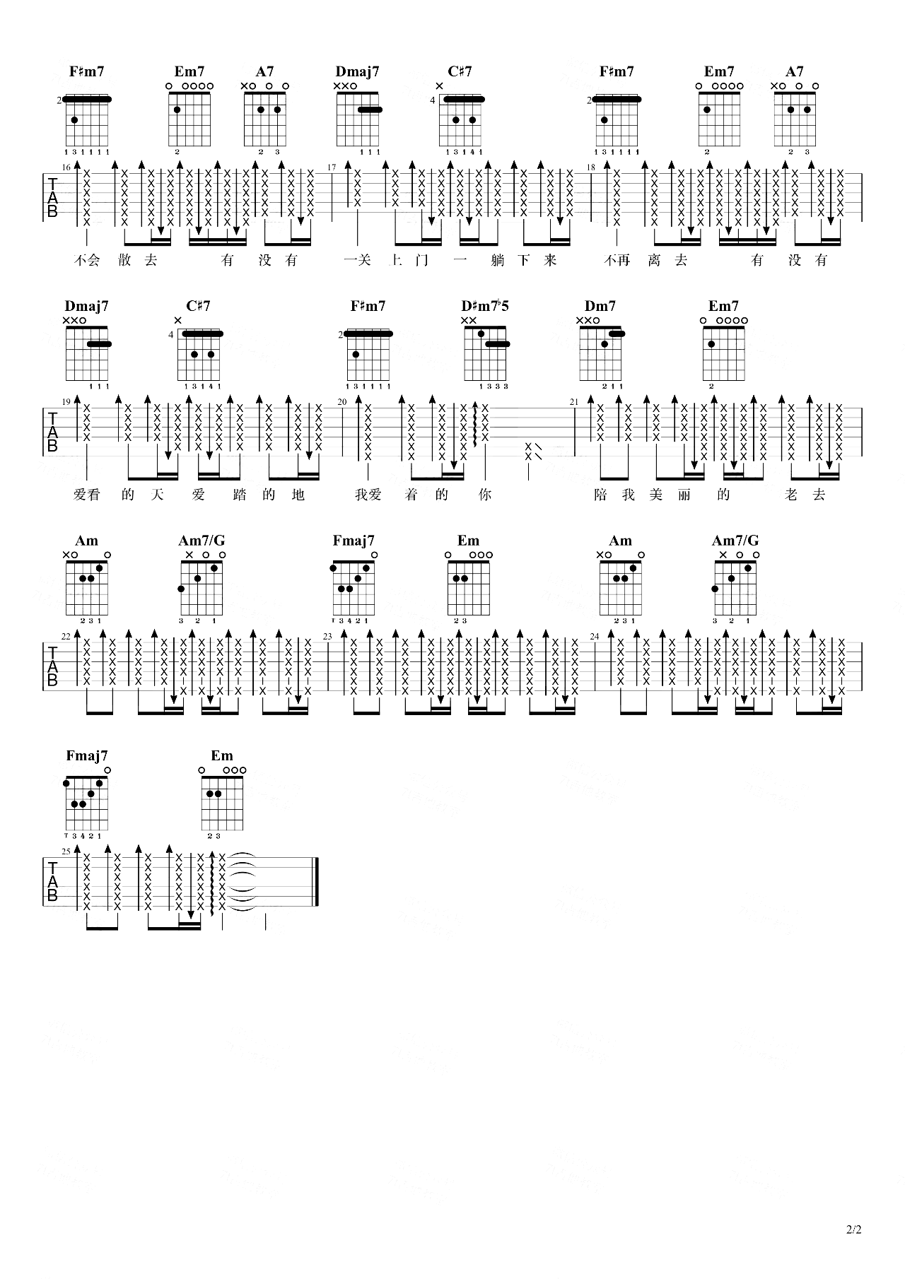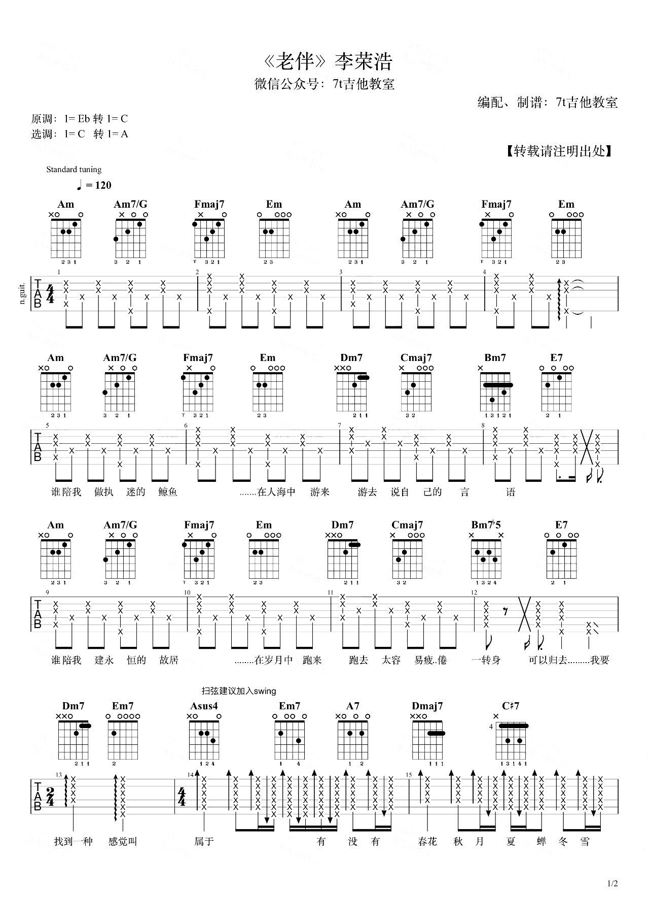 曲谱介绍: 老伴吉他谱,李荣浩创作演唱,曲谱原调Eb转C,选用C调和弦指法编配,两张图片六线谱。《老伴》吉他弹唱视频里是标准音调弦,没有使用变调夹。想弹原调的话需要夹第3品哦。和弦色彩方面(注意这首歌是一首小调的歌曲,比如主歌用a小调来编配,一级和弦就是Am,如此类推),二级用了小七或半减七;三级用了maj7;四级用了小七;五级用了属七;六级用了maj7(主歌和副歌是两个不同的调,以上和弦色彩的总结涵盖了这两个调)…… 主歌是一个从主和弦开始,低音不断下行的走向,其中用了一些斜杠和弦,最后以五级属七和弦E7结束,大家可以留意一下这种有趣的编曲。副歌转到了其它调,在进入新的调之前用了251来过渡 Em7 → A7 → Dmaj7,这是转调的惯用手法,大家可以熟记哦! 歌曲最后用了升四级半减七D#m7-5(严格来说在小调里是升六级,但副歌其实没有明显的大小调的区分,为了方便我们把副歌当成A大调来理解吧,对应的关系小调是f#小调),也是总结的升四级半减七的常见用法,不过这首歌由于最后要回到刚开始的调,所以升四级半减七后面接的不是本调的251,而是a小调的451,这也是为什么这首歌的和弦给人一种耳目一新的感觉。