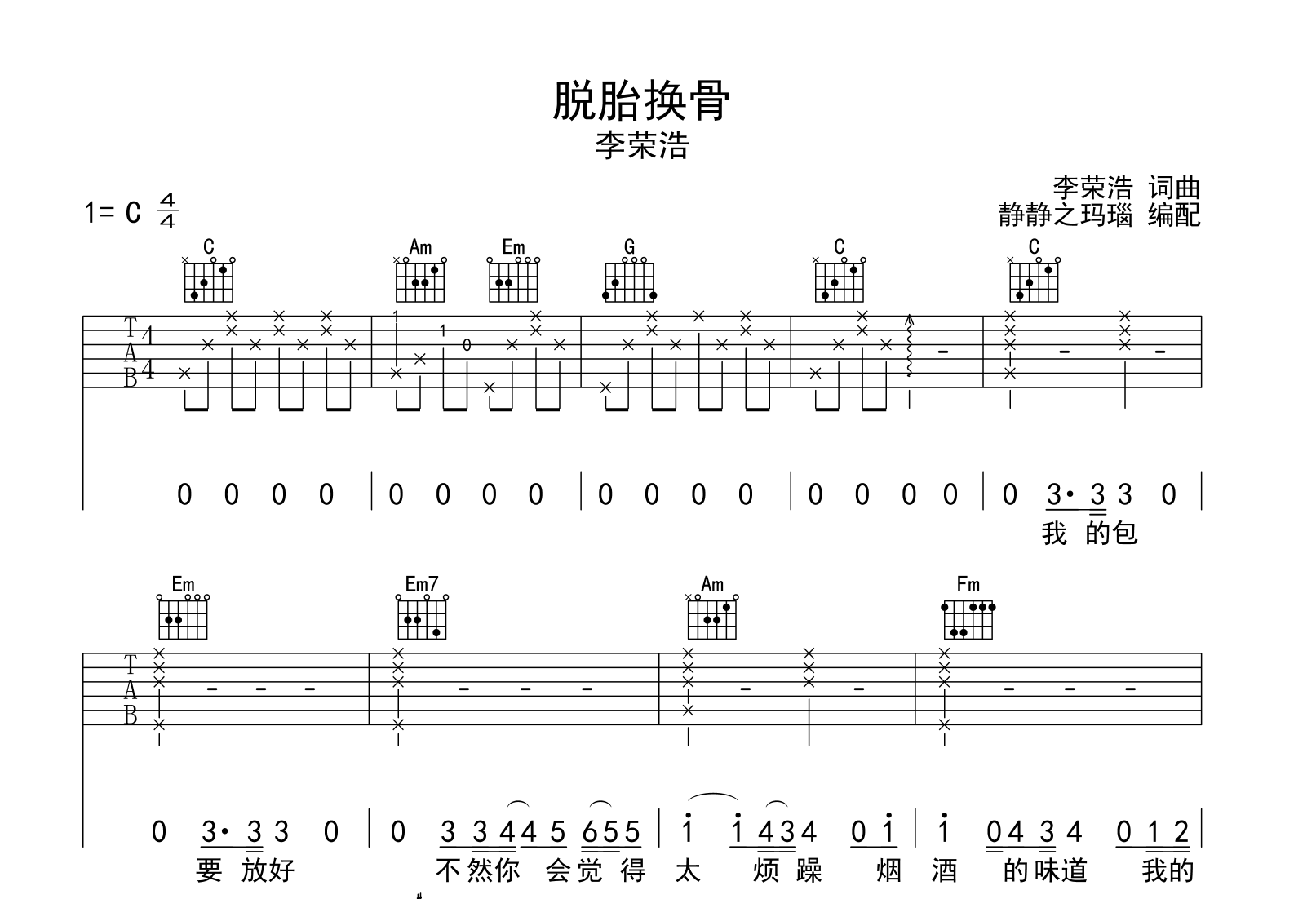 曲谱介绍: 李荣浩《脱胎换骨》吉他谱,由@静静之玛瑙制谱,《脱胎换骨》吉他弹唱谱,共三张图片谱,本谱采用C调和弦指法编配,节奏为4/4拍,速度为90拍每分钟,弹唱建议不夹变调夹,也可以根据个人嗓音找到一个舒服的位置,难度初级。