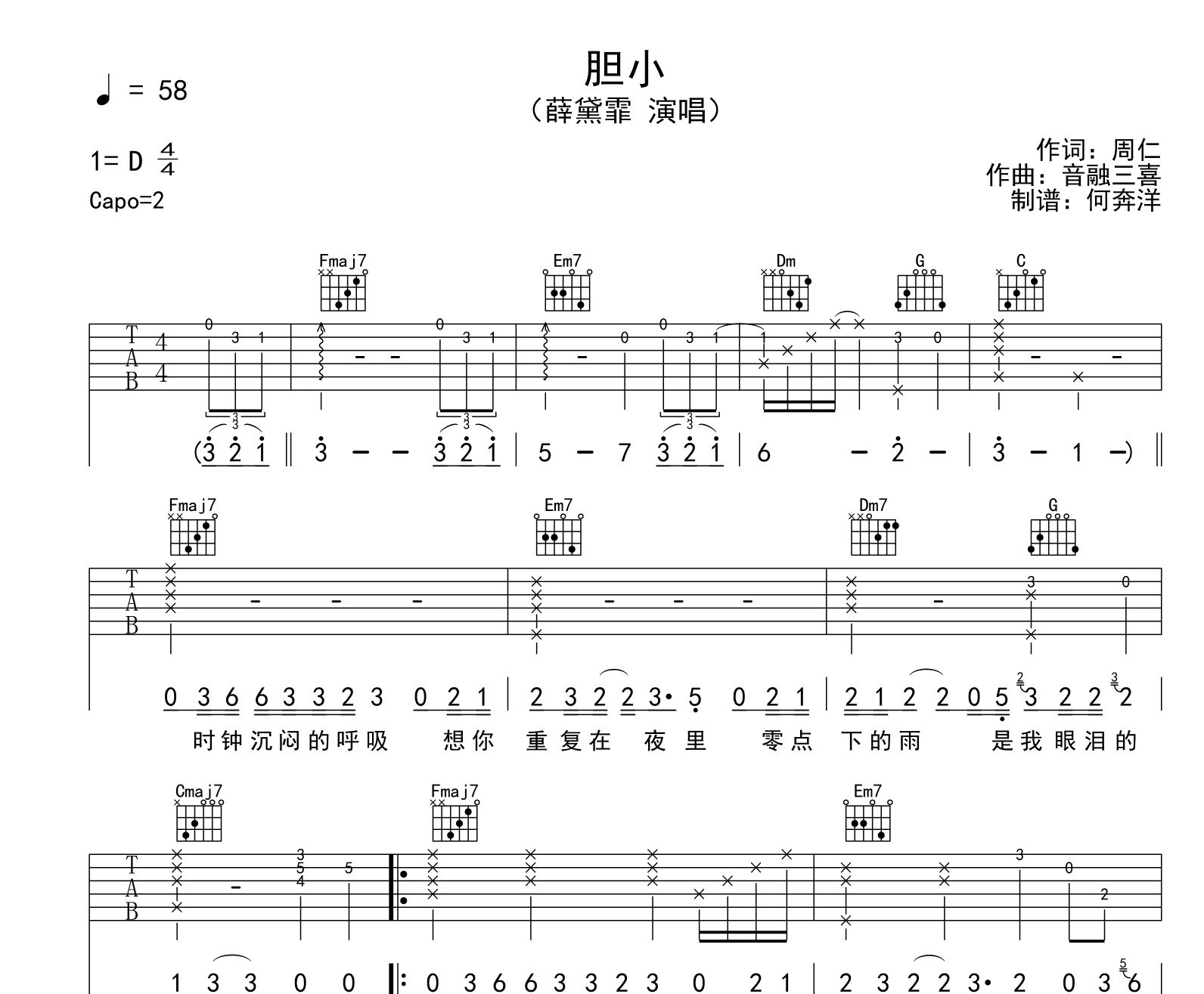 曲谱介绍: 薛黛菲《胆小》吉他谱【附弹唱演示】,由@何奔洋制谱,共有2张高清图片谱例,本谱为C调吉他弹唱谱,变调夹2品弹唱原调D调,节奏4/4拍,速度58BPM,弹唱难度较简单。 吉他弹唱预览音频: