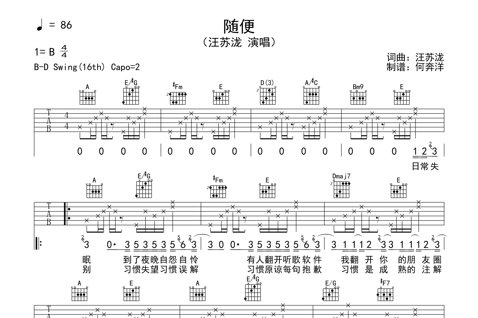 曲谱介绍: 汪苏泷《随便》吉他谱,由@何奔洋制谱,共2张高清图片谱,选A调转C编配,夹2品为原调,节奏4/4拍,速度86BPM,两页紧凑排版,弹唱难度适中,节奏细节上需要注意把握。