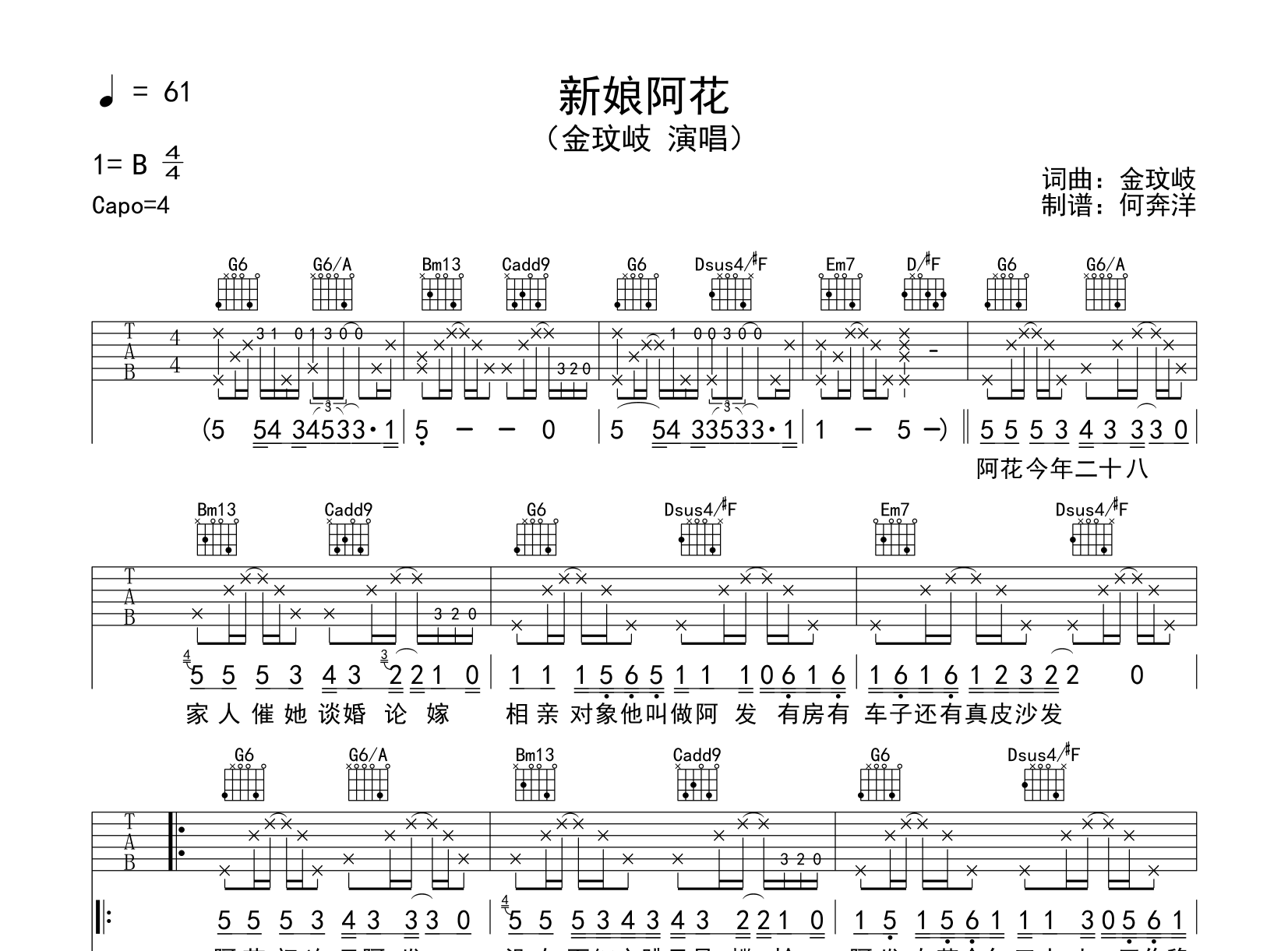 曲谱介绍: 金玟岐《新娘阿花》吉他谱【附弹唱音频】,由创作者@何奔洋编配制谱,本谱为G调吉他弹唱谱,变调夹可夹4品弹唱原调B调,共有2张高清图片谱例,节奏4/4拍,速度61BPM,弹唱难度较简单。 吉他弹唱预览音频: