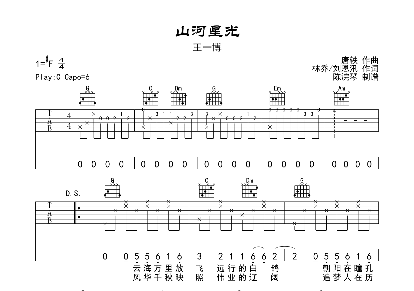 曲谱介绍: 由断湘弦制谱的《山河星光》吉他谱,共有3张高清图片谱例,本谱为C调指法编配,变调夹夹6品,弹唱原调#F,节奏4/4拍,难度较简单。