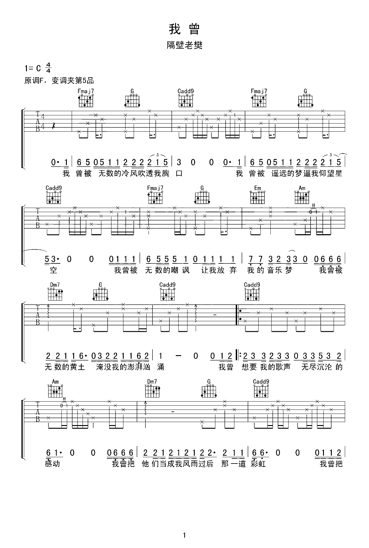 我曾吉他谱 - 隔壁老樊 - C调吉他弹唱谱