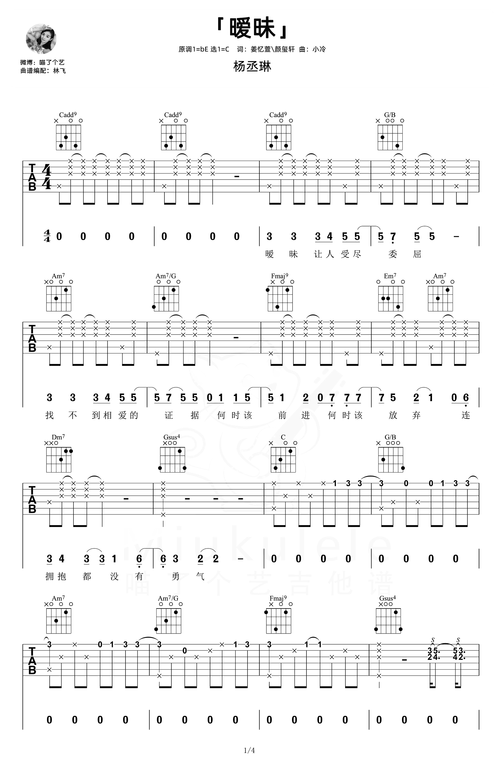 曲谱介绍: 杨丞琳《暧昧》吉他谱,由喵了个艺编配制谱,共有4张高清PNG图片谱例,本谱为C调吉他弹唱谱,原调bE,变调夹夹4品弹唱原调,随谱附《暧昧》吉他弹唱演示视频,大家可在本谱下方参考练习。 《暧昧》吉他弹唱演示视频