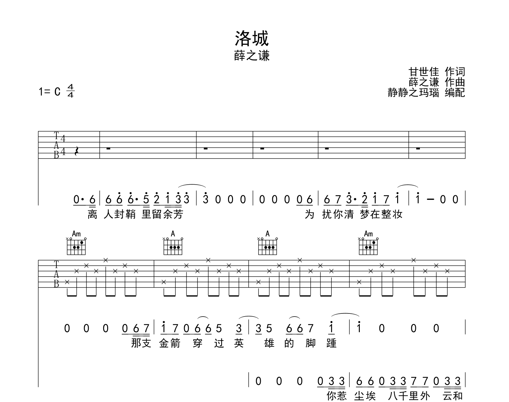 曲谱介绍: 薛之谦《洛城》吉他谱,由@静静之玛瑙制谱,共有5张高清图片谱例,本谱采用C调和弦指法编配,节奏为4/4拍,速度为80拍每分钟,弹唱建议不夹变调夹,也可以根据个人嗓音找到一个舒服的位置,难度较简单。