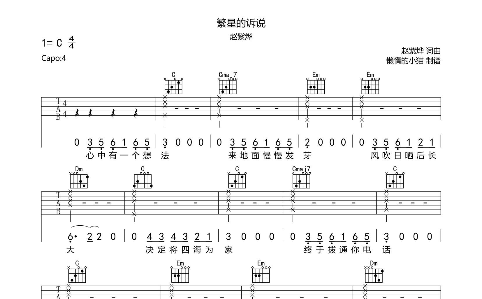 曲谱介绍: 由创作者赵紫烨制谱的《繁星的诉说》吉他谱,共有4张高清图片谱例,原调为E调,使用C调指法编配,变调夹建议夹在4品处弹唱,速度65BPM,简易上手。