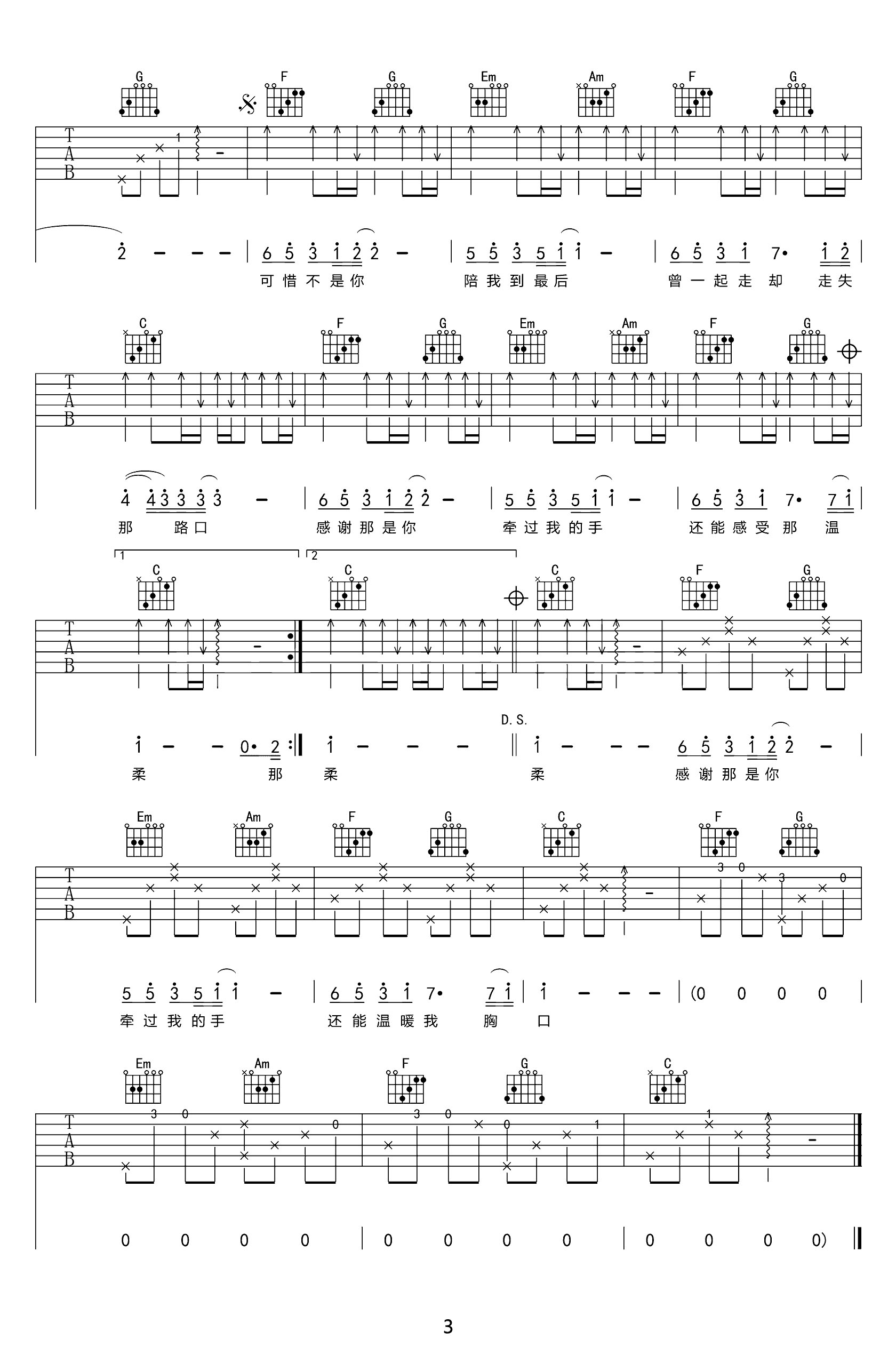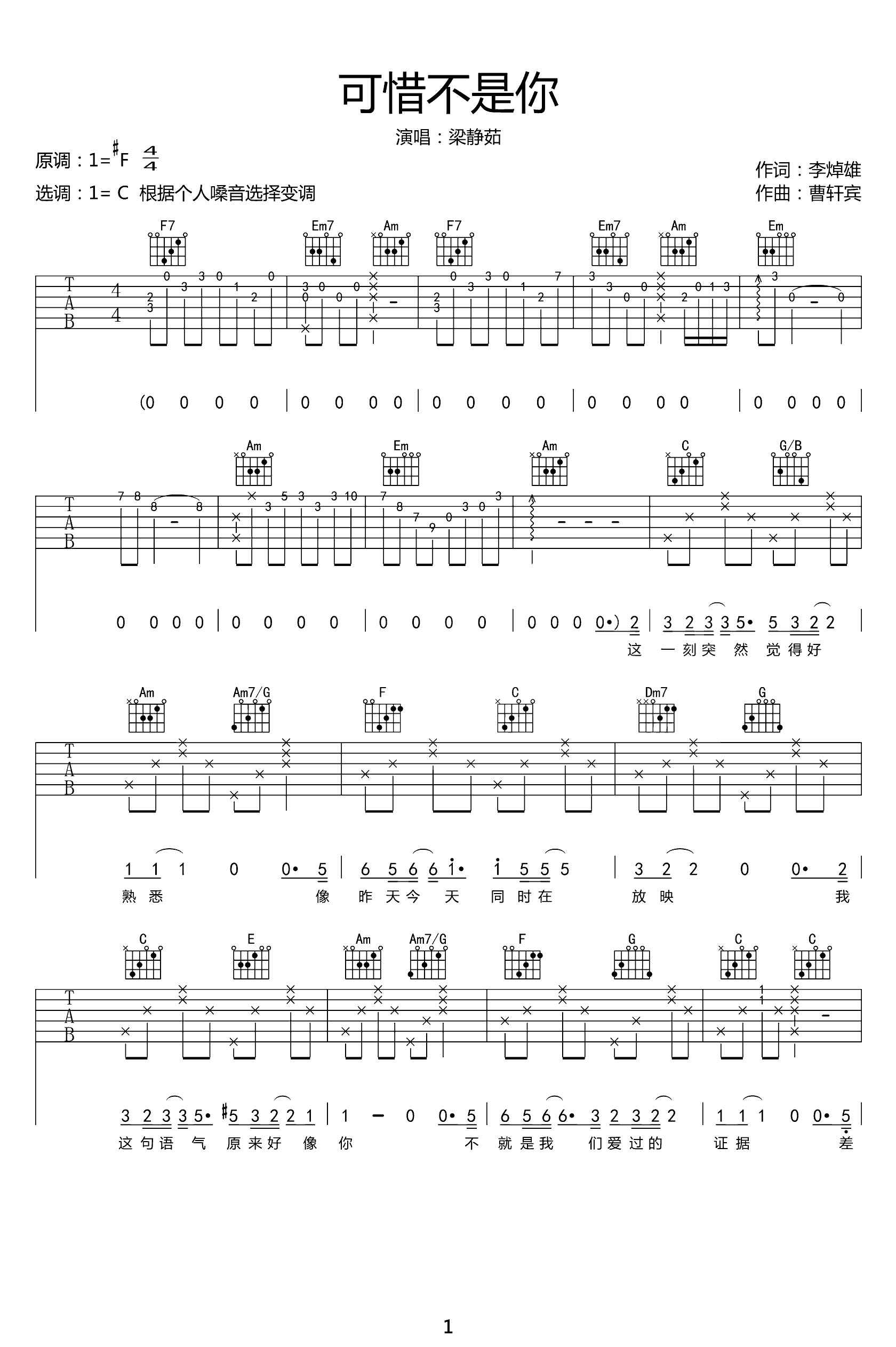 曲谱介绍: 《可惜不是你》吉他谱【纯净原版】,共有3张高清六线谱图例,本谱为C调吉他弹唱谱,原调#F,可以夹6品,男生可不用变调夹进行弹唱,节奏4/4拍,本谱按原曲节奏进行编配还原度较高,难度较简单。