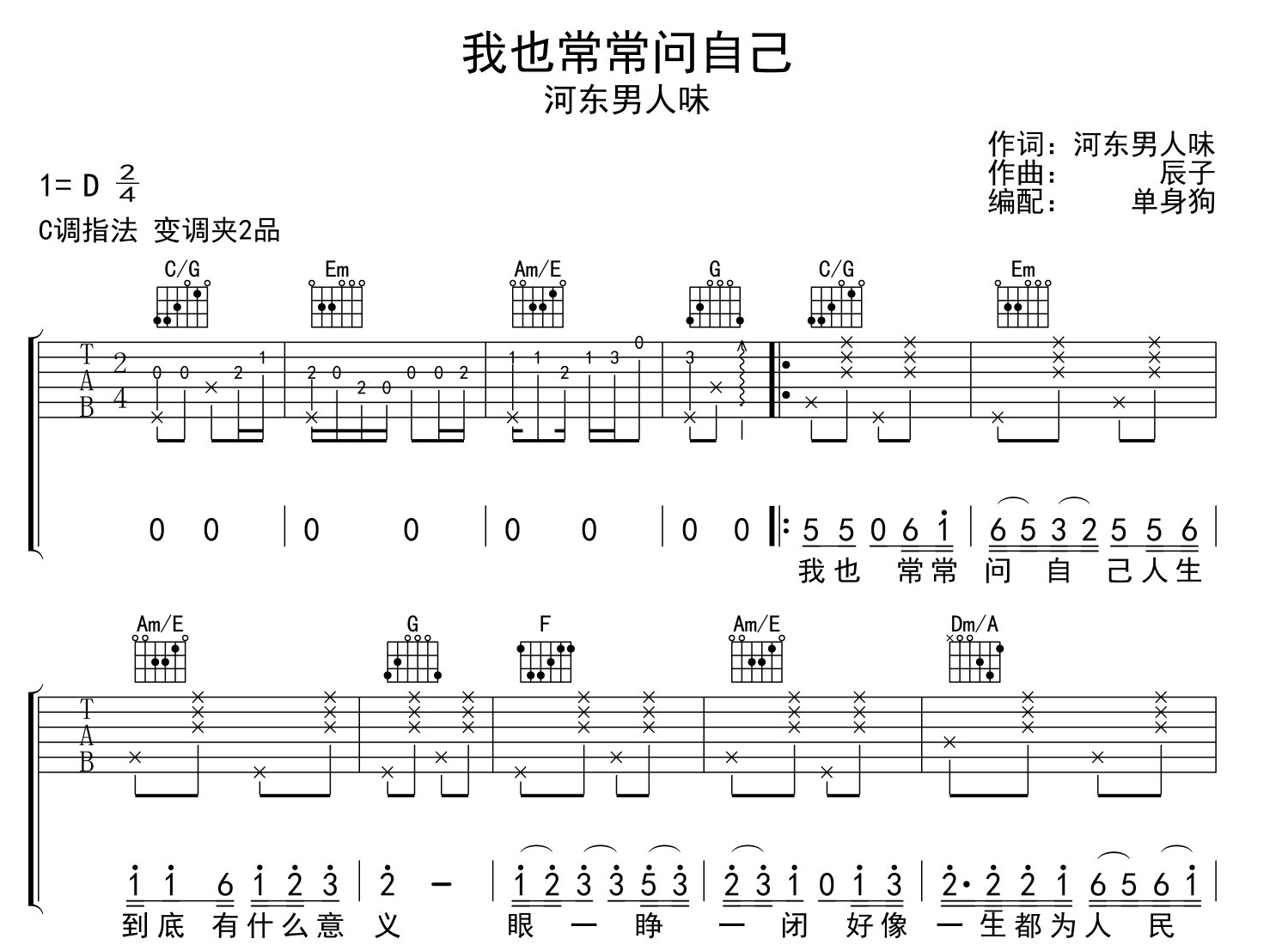 曲谱介绍: 由创作者单身狗编配制谱的《我也常常问自己》吉他谱,共有2张高清图片谱例,本谱为C调指法,变调夹建议夹2品处弹唱原调D,节奏2/4拍,弹唱难度较简单。