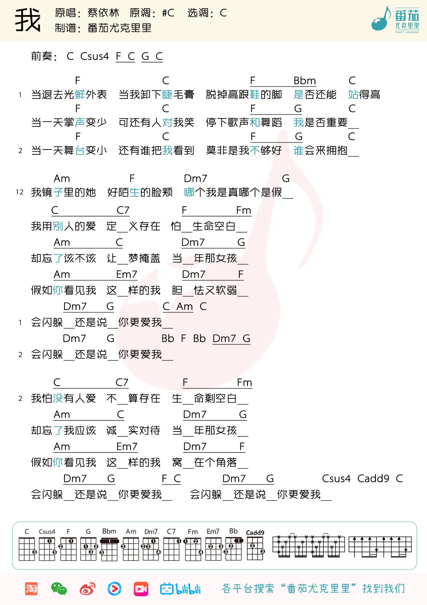 曲谱介绍: 蔡依林MYSELF巡回演唱会北京安可场演唱新专辑歌曲《我》 这首歌由蔡健雅作曲,小寒填词,希望透过《我》让大家走进Jolin的世界,并也感受到其实我们都一样,若摘下最光鲜亮丽的外表,世界甚至自己还会爱这样的‘我’吗?   弹唱曲谱