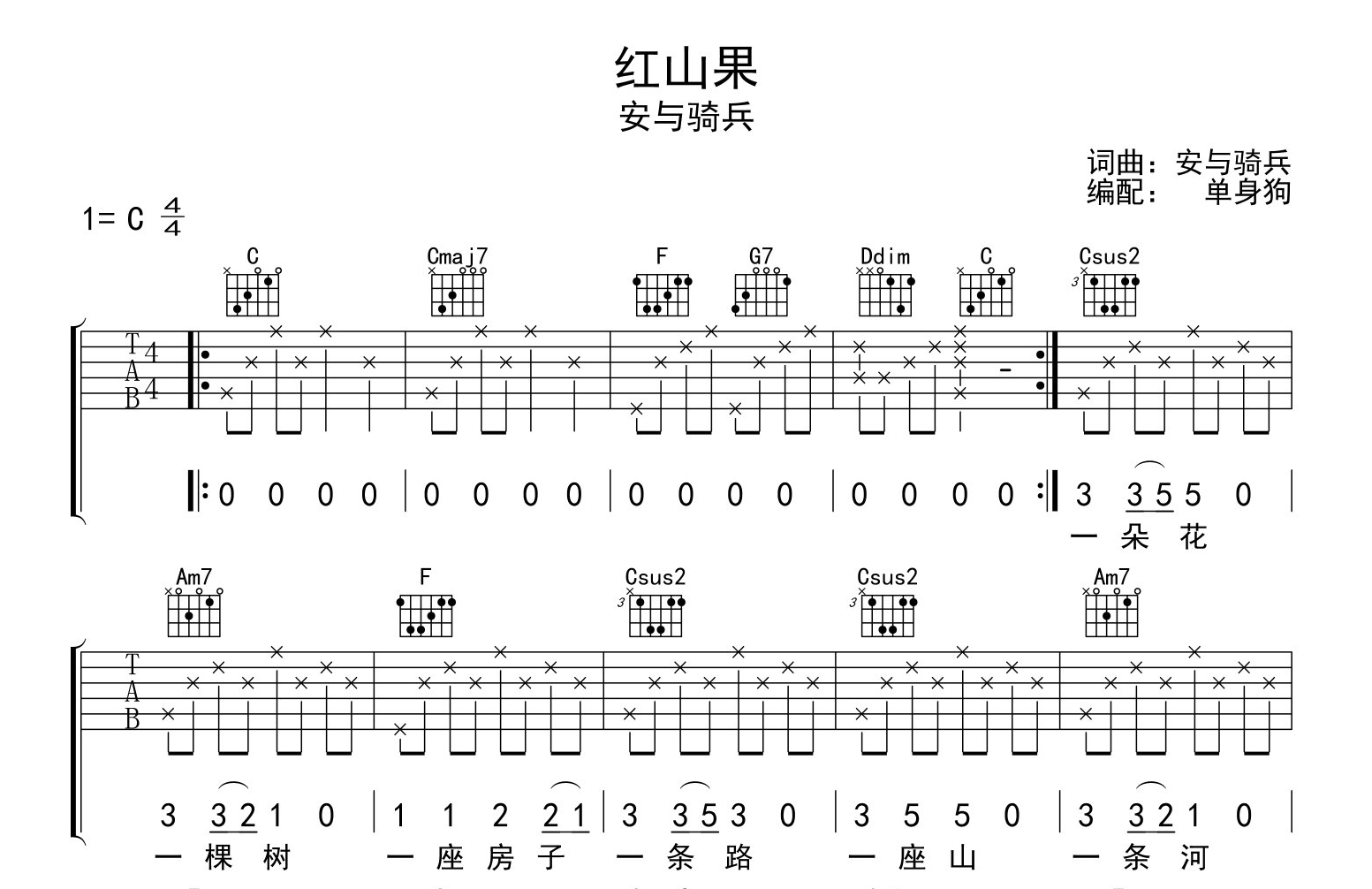 曲谱介绍: 由单身狗制谱的《红山果》吉他谱,共有3张高清六线谱图例,本谱为C调吉他弹唱谱,标准调音不用变调夹,节奏4/4拍,弹唱难度比较简单。
