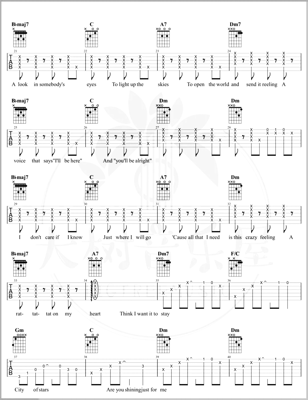 曲谱介绍: 由大树音乐屋制谱的《City Of Stars》吉他谱【超原版编配】,共有3张高清图片谱例,本谱原调和选调都是D小调,变调夹可夹1品或不夹弹唱,随谱下方附本谱《City Of Stars》的吉他演示/教学视频。 《City Of Stars》吉他弹唱演示视频 《City Of Stars》吉他弹唱教学视频