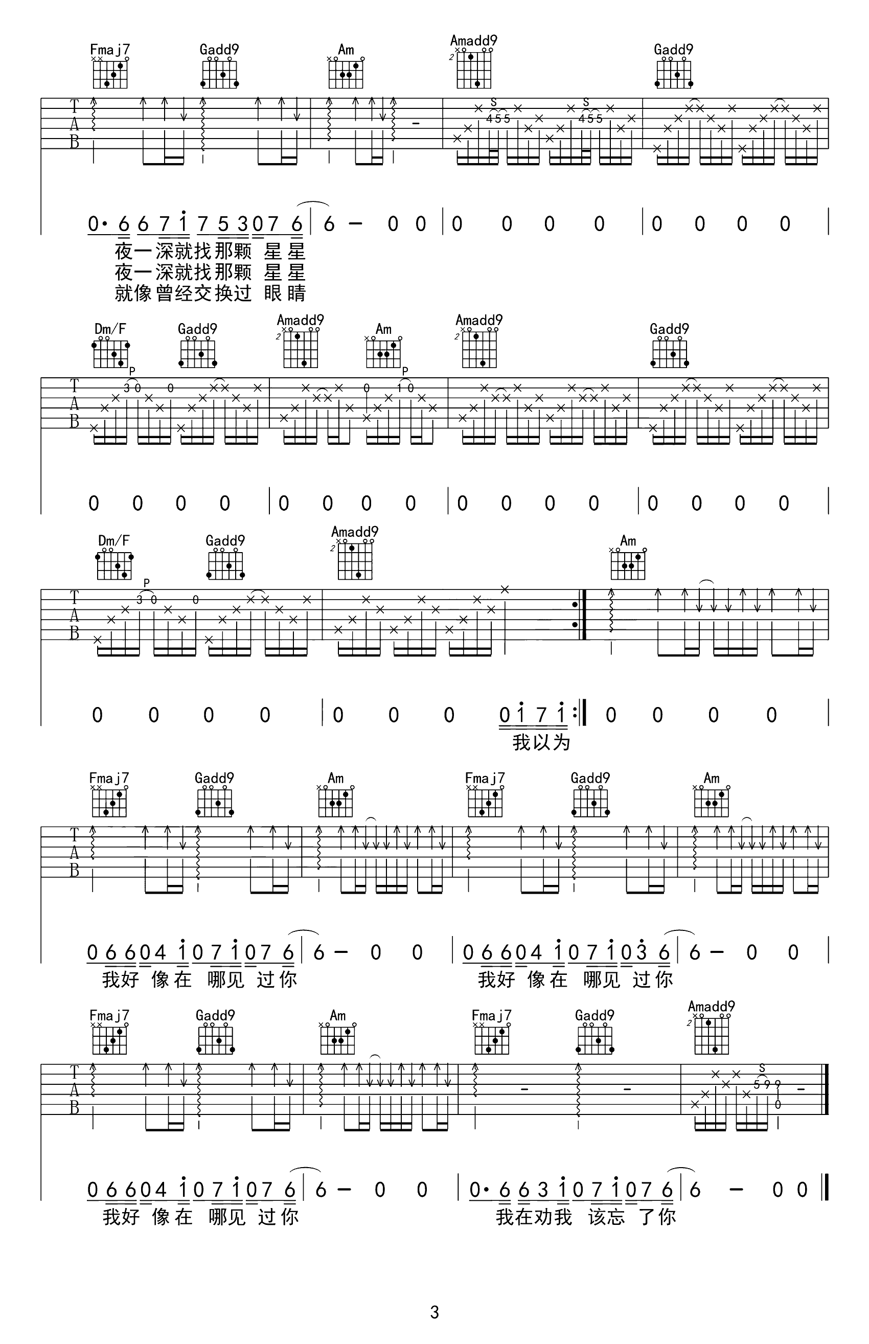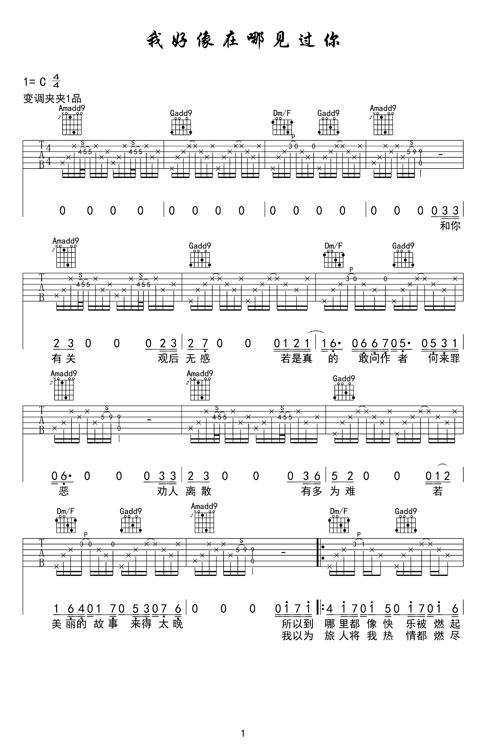 曲谱介绍: 《我好像在哪见过你》吉他谱,共有3张高清图片谱例,本谱为C调吉他弹唱谱,变调夹夹1品弹唱原调,节奏4/4拍,难度适中,节奏和指法的变换需要花时间耐心掌握。