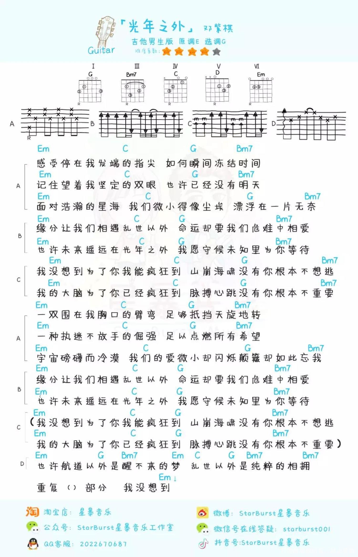 曲谱介绍: 〈光年之外〉是由邓紫棋作词、作曲并演唱的歌曲,是电影《太空旅客》中国区主题曲、片尾曲,于2016年12月30日发行。2017年6月12日,该歌曲获得MTV全球华语音乐盛典最佳十大金曲奖。12月11日,荣获Billboard Radio China 2017年度华语十大金曲奖。 女生版教学 男生版教学 尤克里里曲谱 吉他曲谱