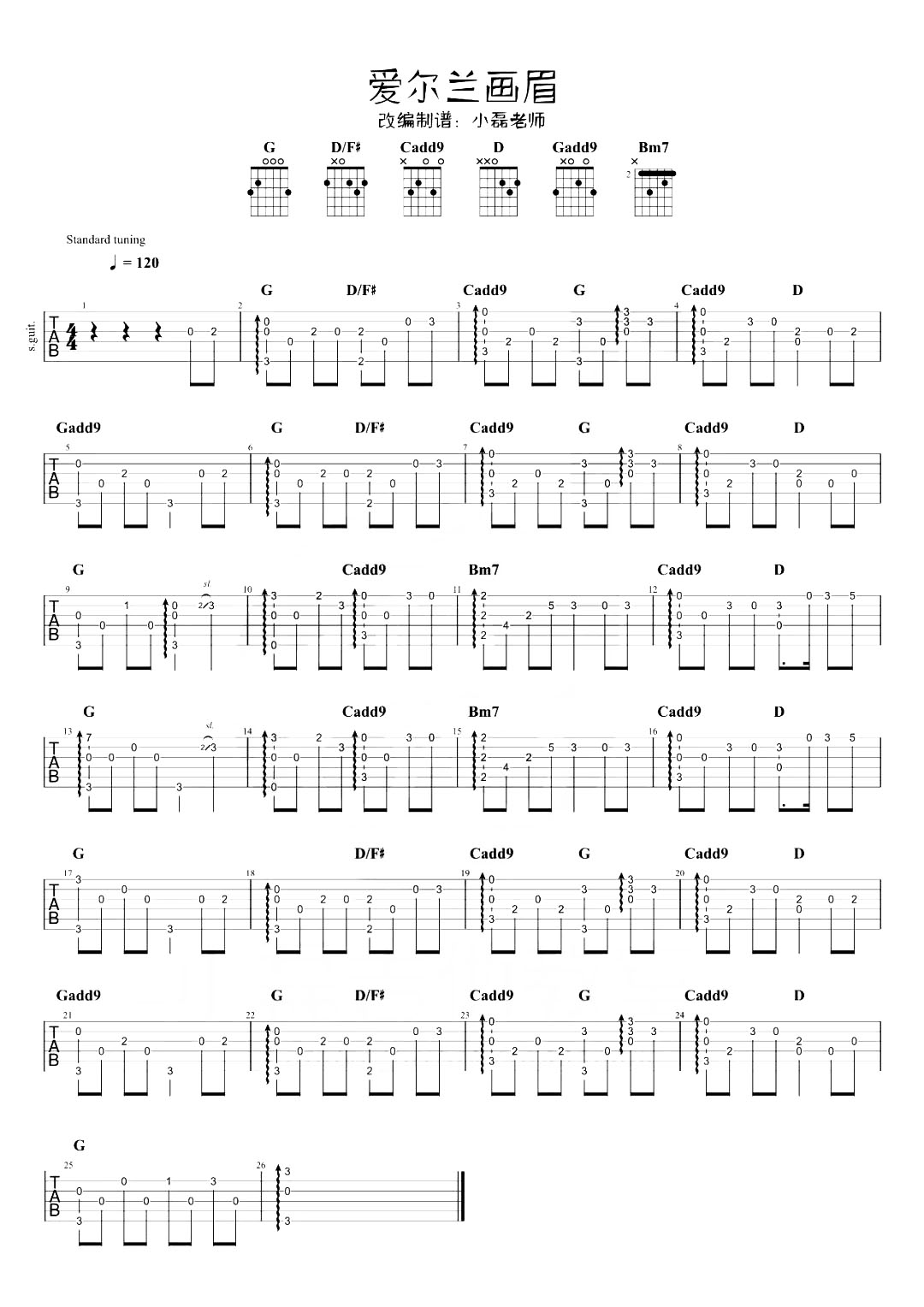 曲谱介绍: 《爱尔兰画眉》指弹谱,由小磊吉他教室编配制谱,变调夹可以夹2品处,速度120BPM,这首独奏六线谱附了指弹演示+教学视频,大家可以跟着小磊老师的视频教学练习。 《爱尔兰画眉》指弹演示/教学视频