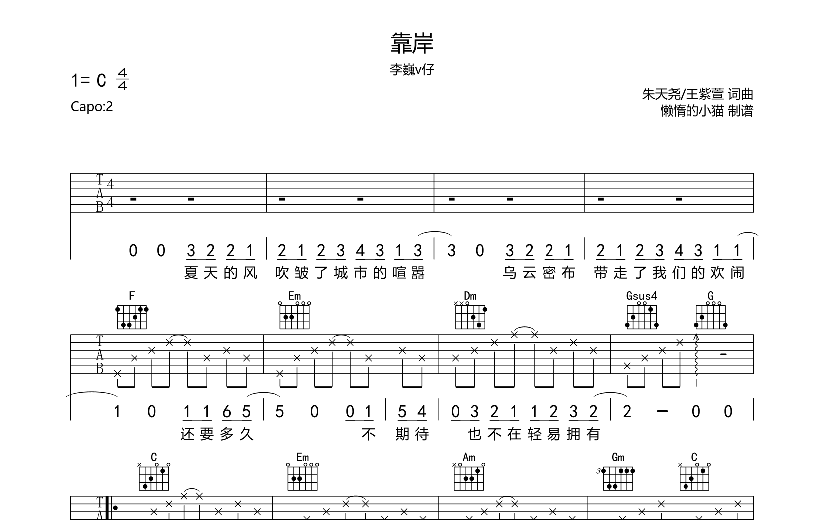 靠岸吉他谱 - 李巍V仔 - C调吉他弹唱谱