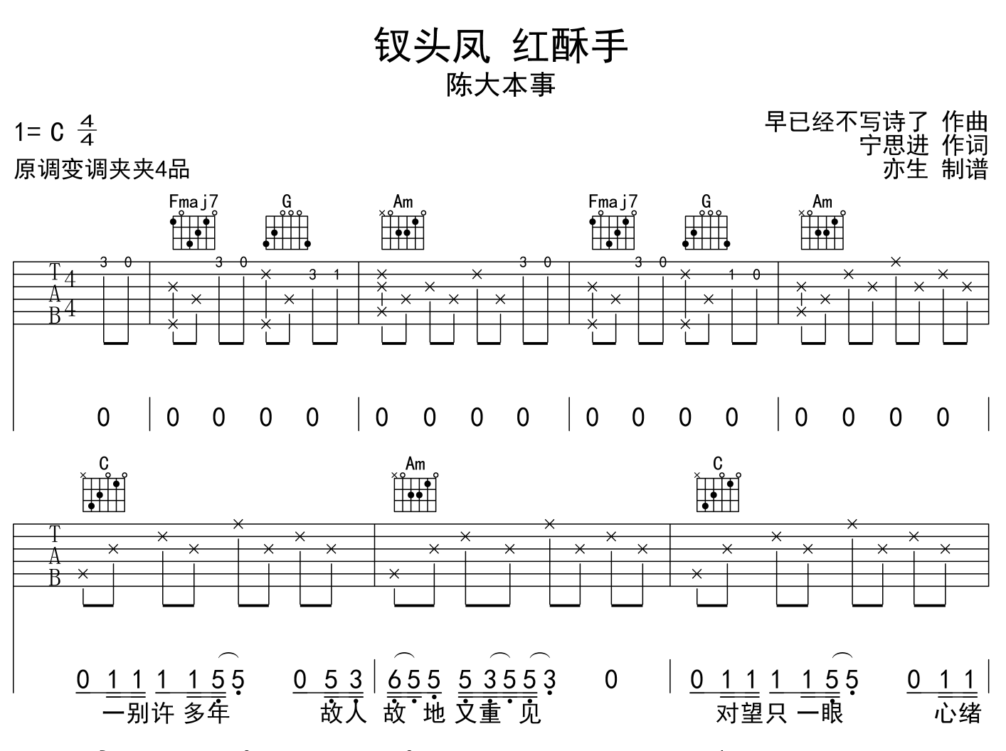 曲谱介绍: 陈大本事《钗头凤 红酥手》吉他谱,由创作者亦生制谱,共有三张高清六线谱图例,本谱采用C调和弦指法编配,节奏为4/4拍,速度为95拍每分钟,弹唱建议变调夹夹4品,难度较简单。