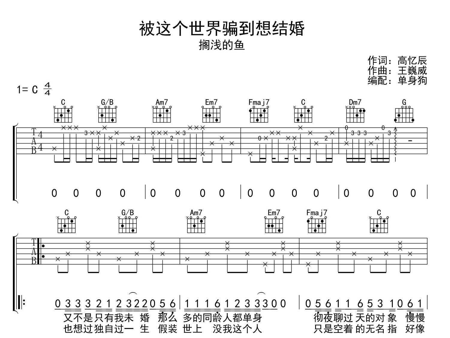曲谱介绍: 《被这个世界骗到想结婚》吉他谱,由单身狗制谱,共两张高清图谱,本谱为C调吉他弹唱谱,标准调音可不用变调夹,节奏4/4拍,难度较简单。