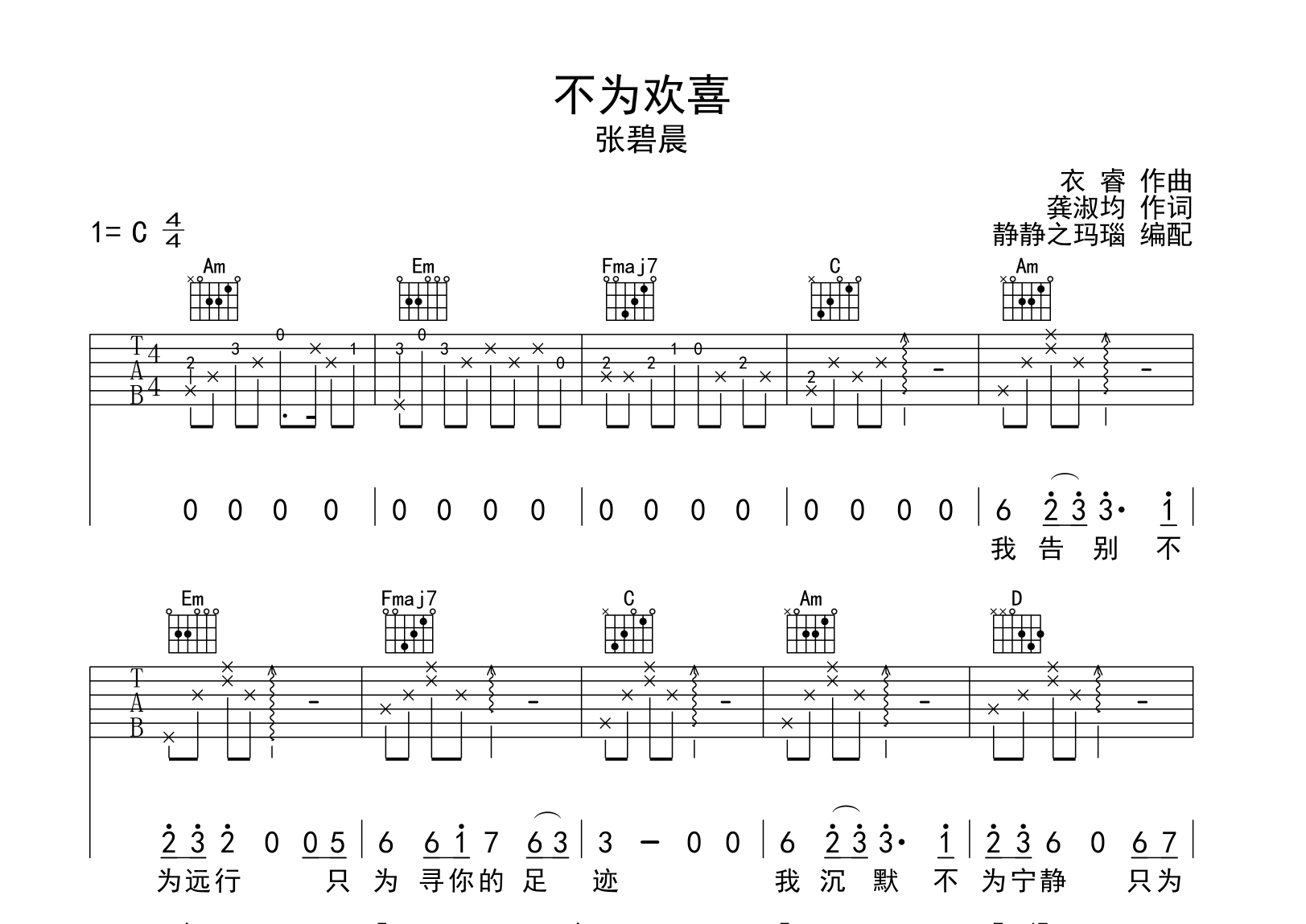 曲谱介绍: 张碧晨《不为欢喜》吉他谱,由创作者李静制谱,共三张高清六线谱图例,本谱采用C调和弦指法编配,节奏为4/4拍,速度为75拍每分钟,弹唱建议变不夹调夹,也可以根据个人嗓音找到一个舒服的位置,难度较简单。