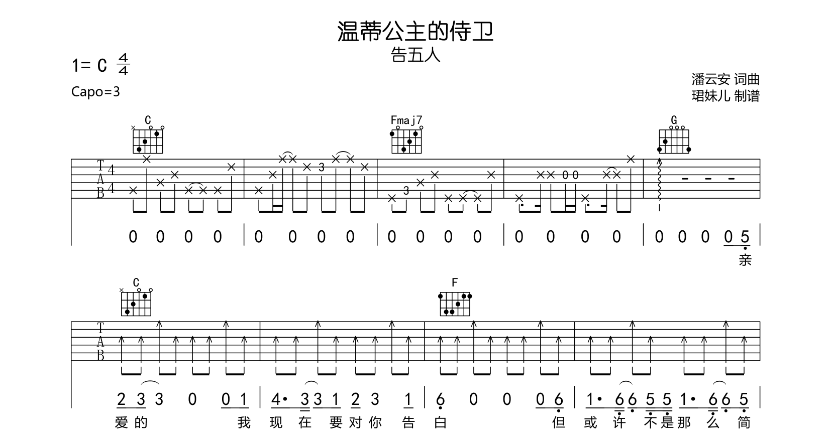 曲谱介绍: 告五人《温蒂公主的侍卫》吉他谱,共有三张高清图片谱例,本谱采用C调指法编配,弹唱建议变调夹3品,速度85BPM,节奏4/4拍,难度较简单易上手。