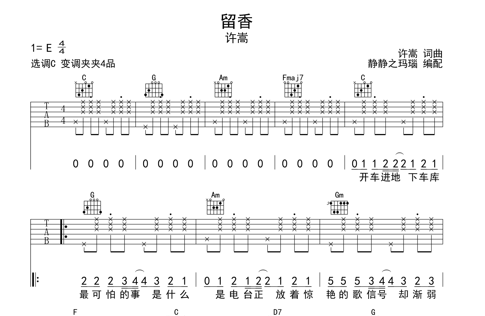 曲谱介绍: 《留香》吉他谱,由创作者李静制谱,共三张高清六线谱图例,本谱采用C调和弦指法编配,节奏为4/4拍,速度为85拍每分钟,弹唱建议变调夹夹4品,也可以根据个人嗓音找到一个舒服的位置,难度初级。