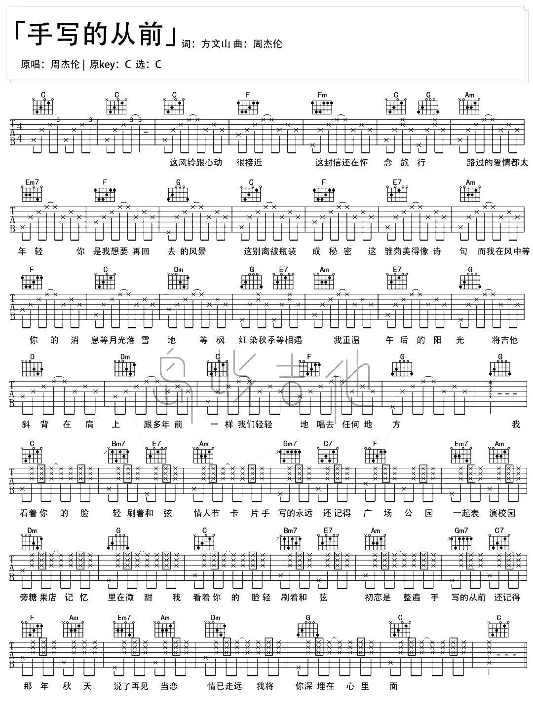 手写的从前吉他谱 - 周杰伦 - C调吉他弹唱谱