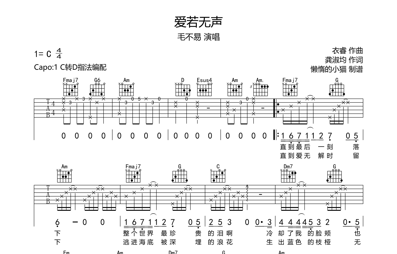 曲谱介绍: 毛不易《爱若无声》吉他谱,由创作者懒惰的小毛制谱,共两张高清六线谱图例,原调为升C转降E,使用C转D指法编配 变调夹1品 ,速度50BPM,节奏4/4拍,难度较简单。