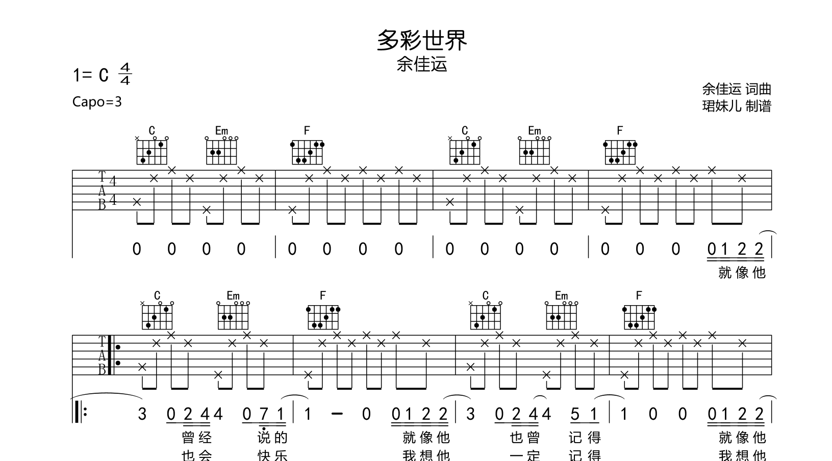 多彩世界吉他谱 - 余佳运 - C调吉他弹唱谱