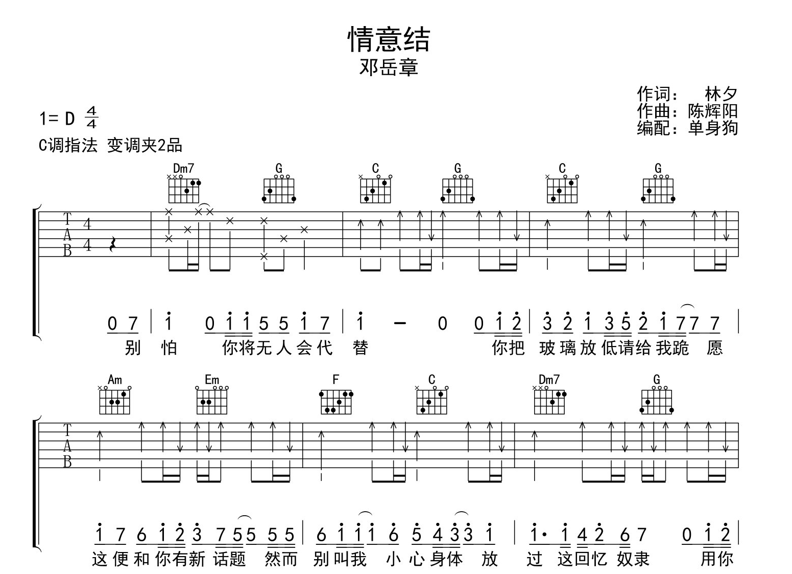 曲谱介绍: 邓岳章《情意结》吉他谱,共有四张高清六线谱图例,本谱为C调指法吉他谱,变调夹夹2品弹唱原调D调,节奏4/4拍,弹唱难度较简单。