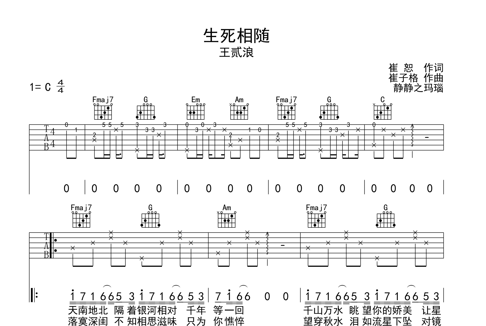 生死相随吉他谱 - 王贰浪 - C调吉他弹唱谱