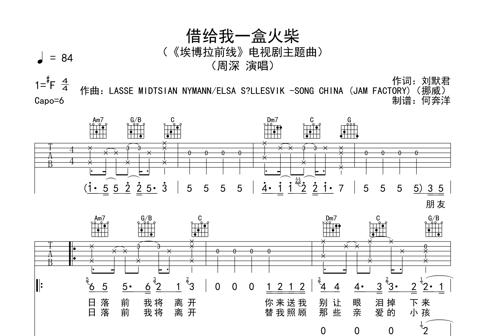曲谱介绍: 由创作者何奔洋制谱的《借给我一盒火柴》吉他谱【附音频演示】,共有两张高清六线谱图例,本谱为C调吉他弹唱谱,变调夹夹6品弹唱原调#F,速度84BPM,节奏4/4拍,难度适中,感兴趣的朋友可以试听音频演示。 吉他弹唱预览音频: