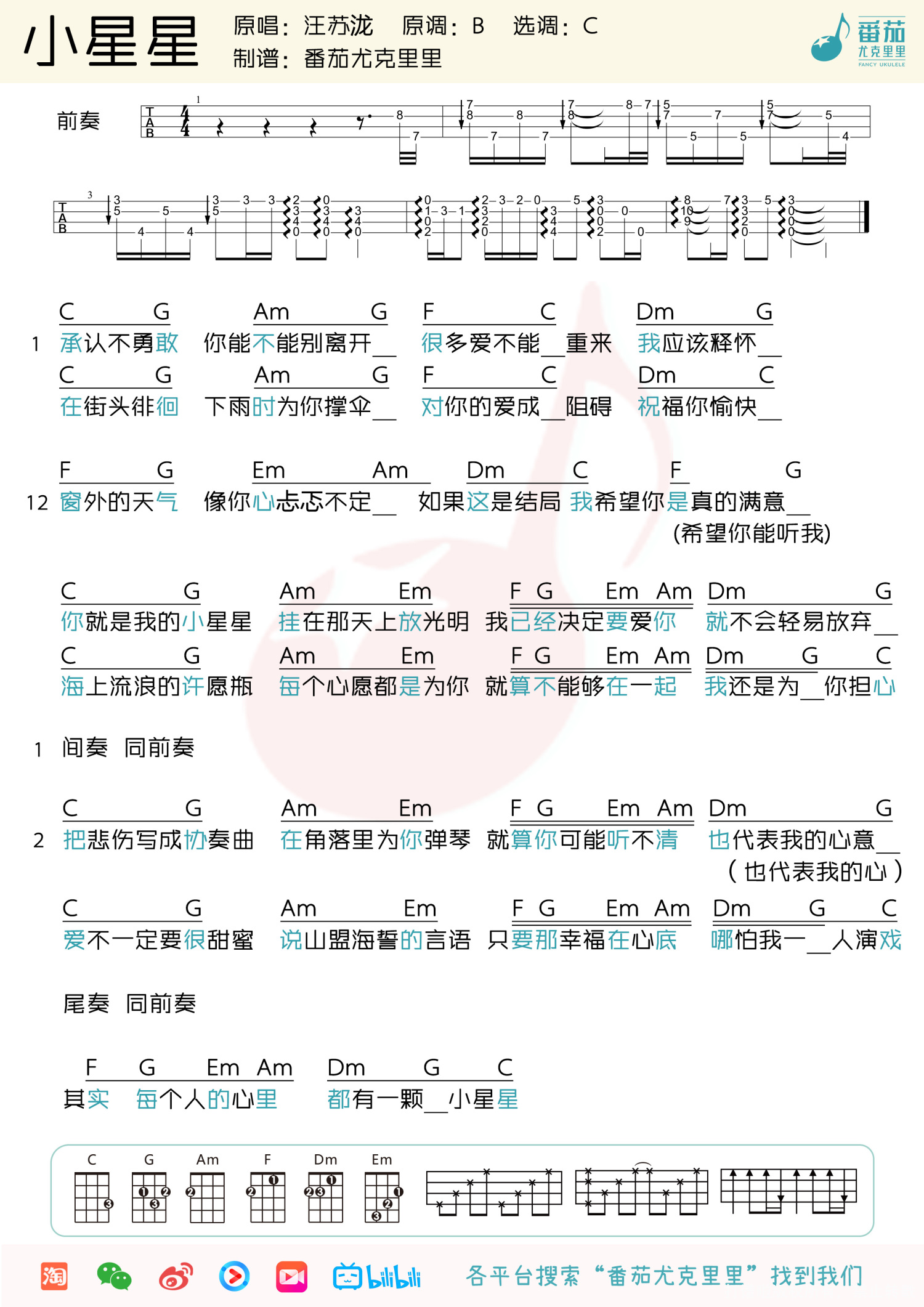 小星星尤克里里谱 - 汪苏泷