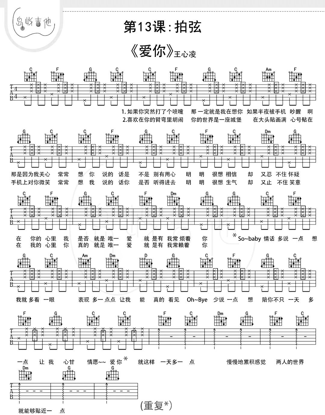 曲谱介绍: 王心凌《爱你》吉他谱,由岛屿吉他制谱,总共仅1张高清六线谱图例,本谱为C调吉他弹唱谱,以半分解+拍弦节奏贯穿全谱,按简单原版进行编配,随谱下方附《爱你》吉他弹唱教学视频,难度比较简单,赶紧上手弹起来吧,这首曲子也是非常适合即兴弹唱活跃气氛,。