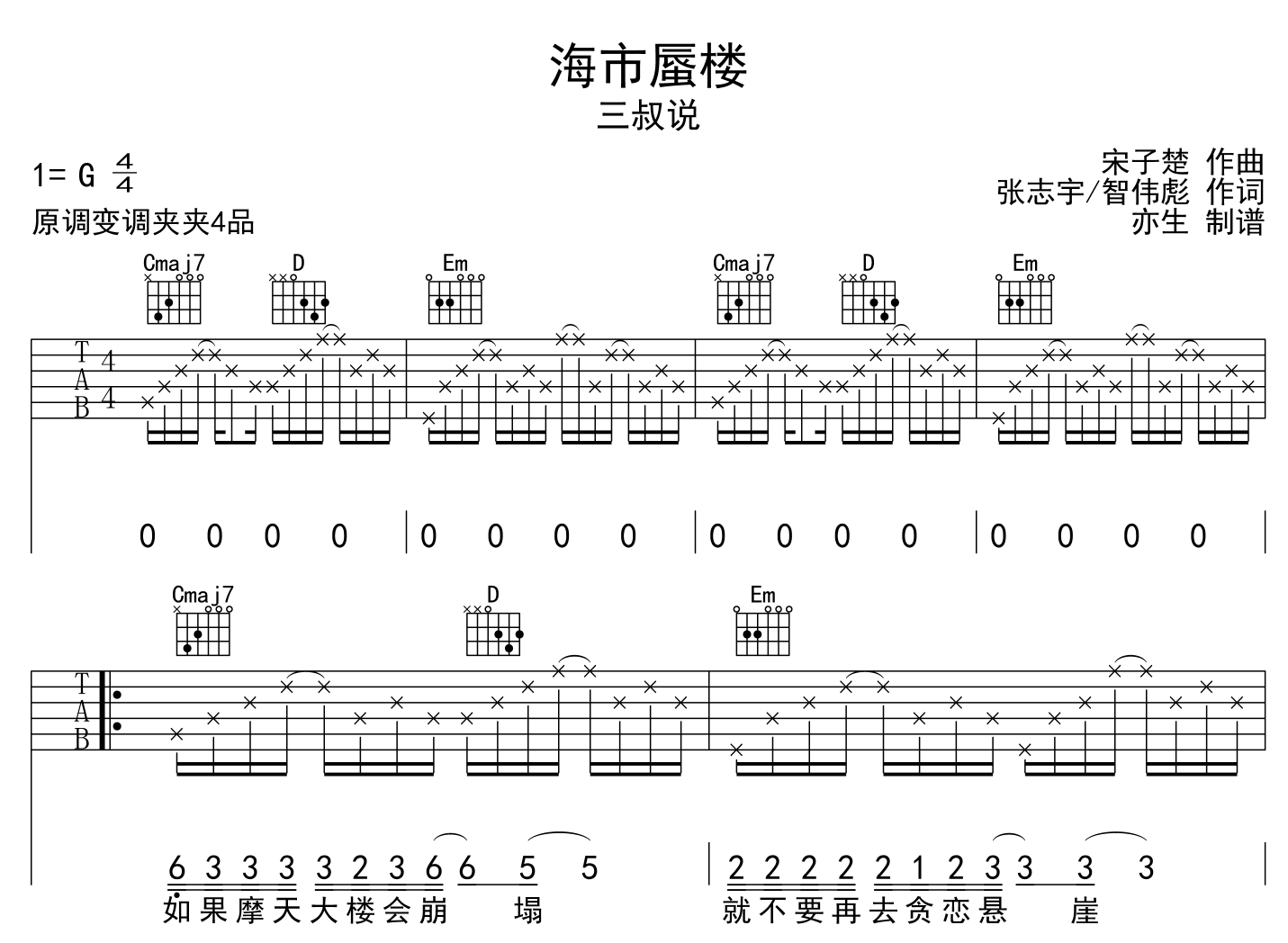 曲谱介绍: 三叔说《海市蜃楼》吉他谱,共有三张高清六线谱图例,本谱采用G调和弦指法编配,节奏为4/4拍,速度为100拍每分钟,弹唱建议变调夹夹4品,难度较简单。